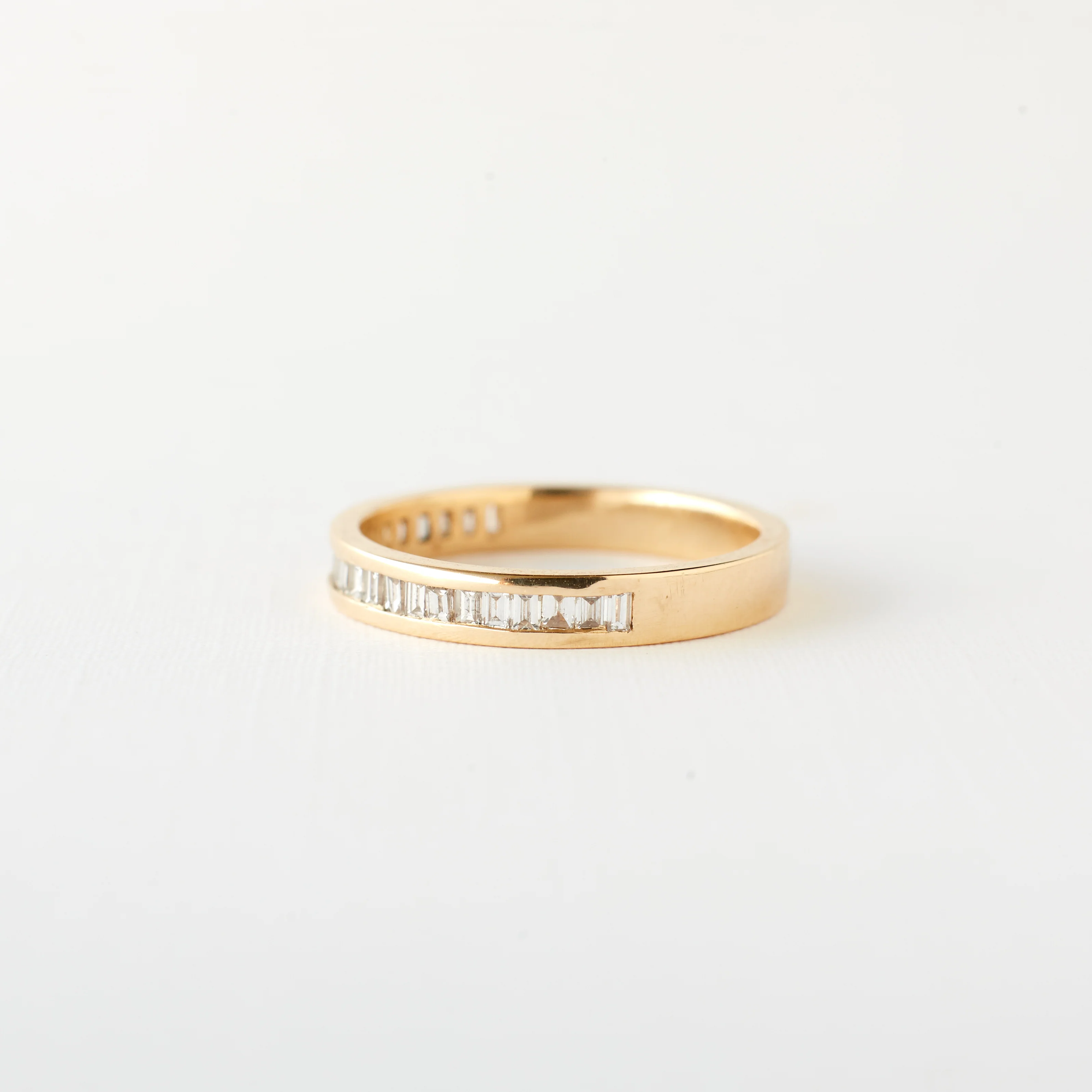 Made for the traditionalists, the Ari band is a classic channel-setting design that compliments a variety of engagement and just-because rings. Set with 22 baguette diamonds around the band, this half-eternity ring adds incredible sparkle to any stack.