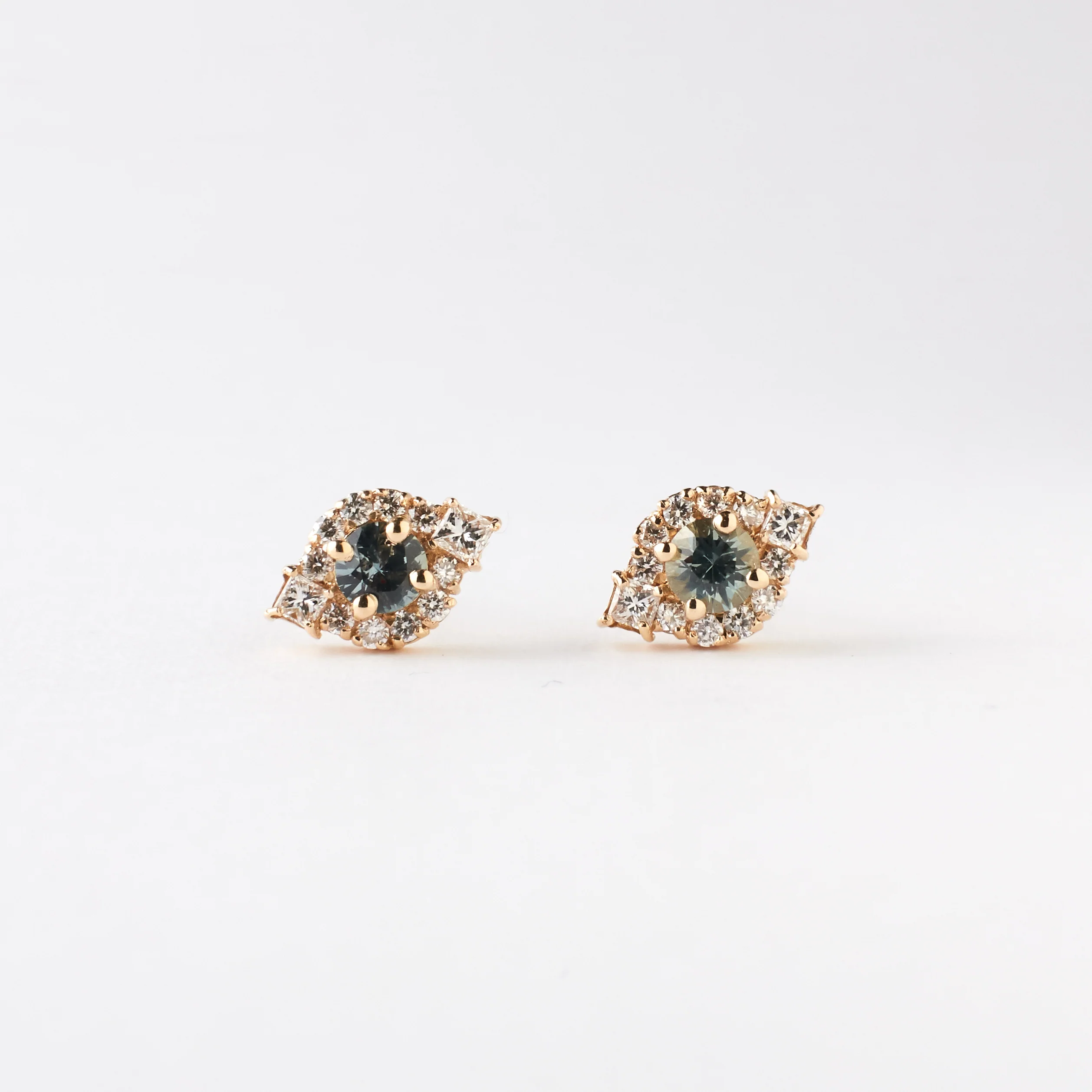 Have you seen our bestselling Brooklyn ring? Well, we made it into earrings! These 14kt yellow gold studs are set with 3mm round sapphires in the most beautiful, water-y teal color and surrounded by a halo of princess-cut and round diamonds. They measure 8.5mm x 5.5mm, so theyâre easy to wear every day and comfortable enough to never take off (if thatâs your thing).Â