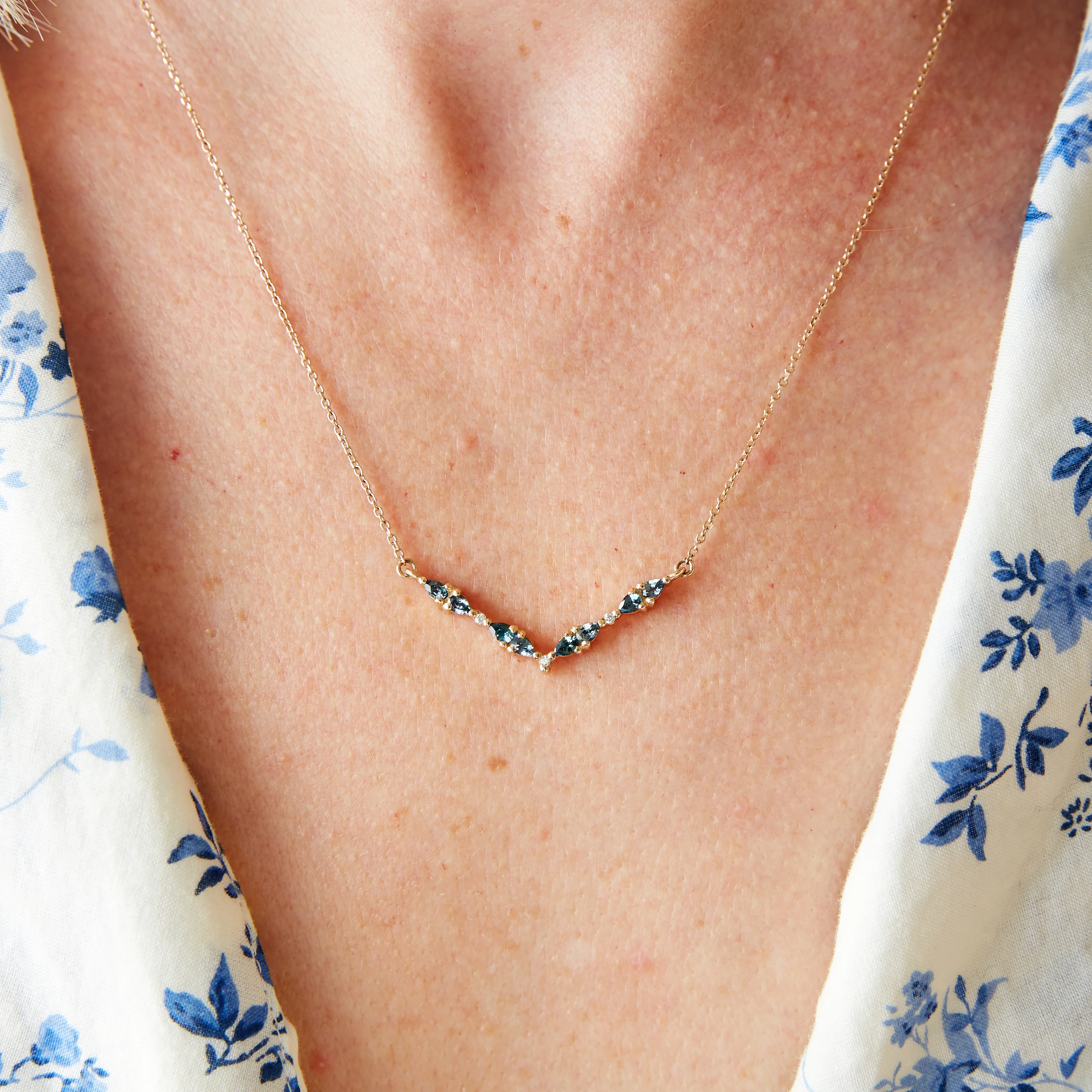 Inspired by our bestselling Willow ring, the Wisteria necklace features custom-cut, pear-shaped sapphires stacked with white diamonds that draw the eye in and catch the light just right. We absolutely love the juxtaposition of the moody blue-green stones with the elegant accent diamonds.
