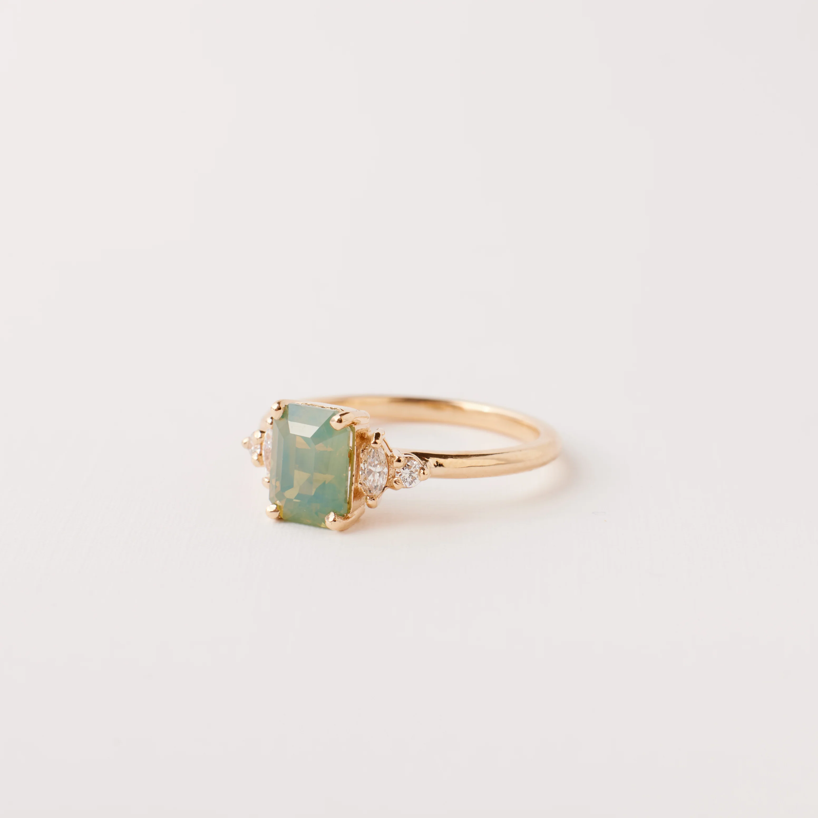 Why it's special: Our Desi ring captivates with a mesmerizing, incredibly interesting and slightly elusive, green-gold opalescent emerald cut sapphire that is reminiscent of limestone, or mineral hot springs, glistening in the golden morning light. We've never seen a sapphire like this one before! This ring will be perfect for the person who appreciates the surprises nature creates.