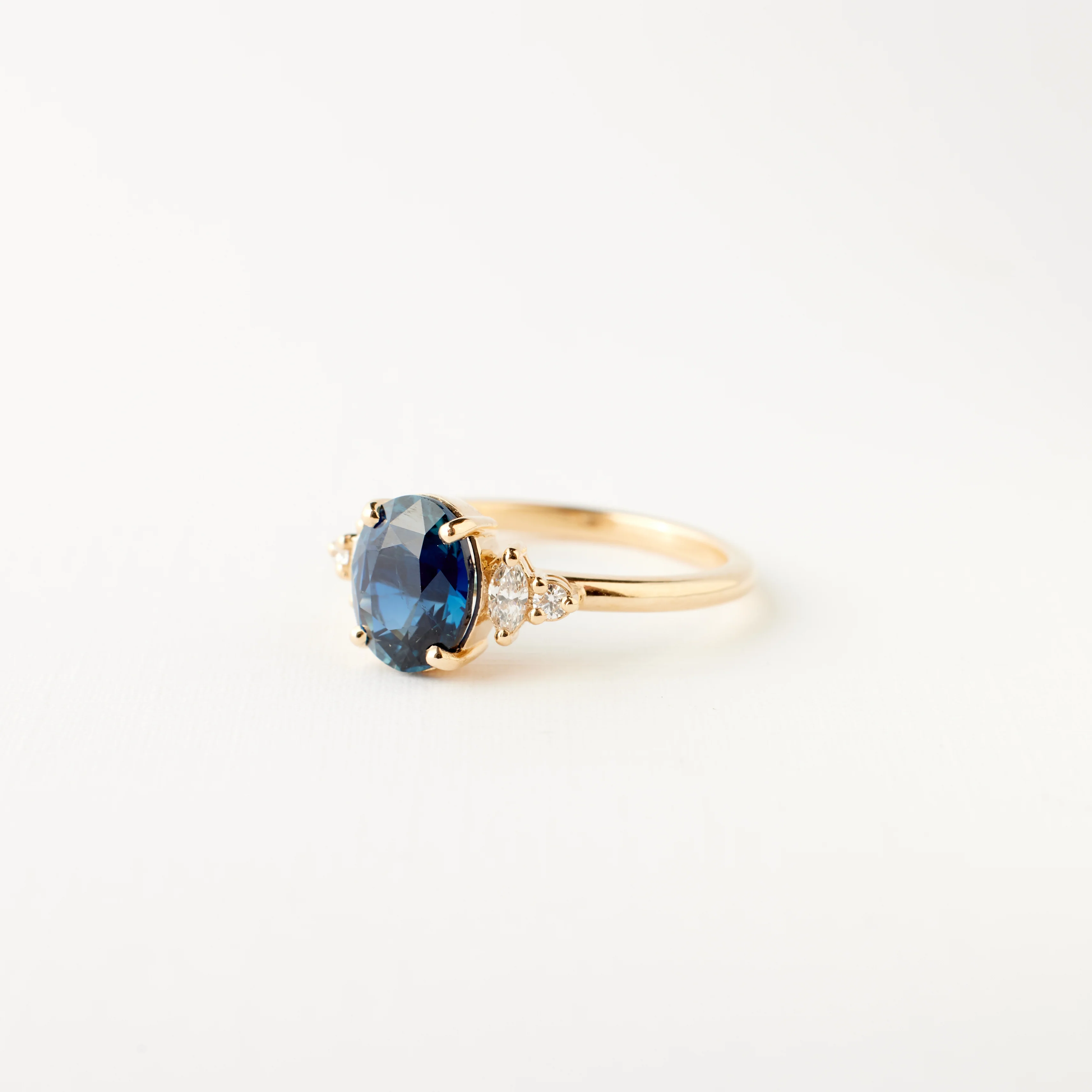 - Set with a 2.12 carat teal blue oval sapphire; heated and ethically sourced from Madagascar