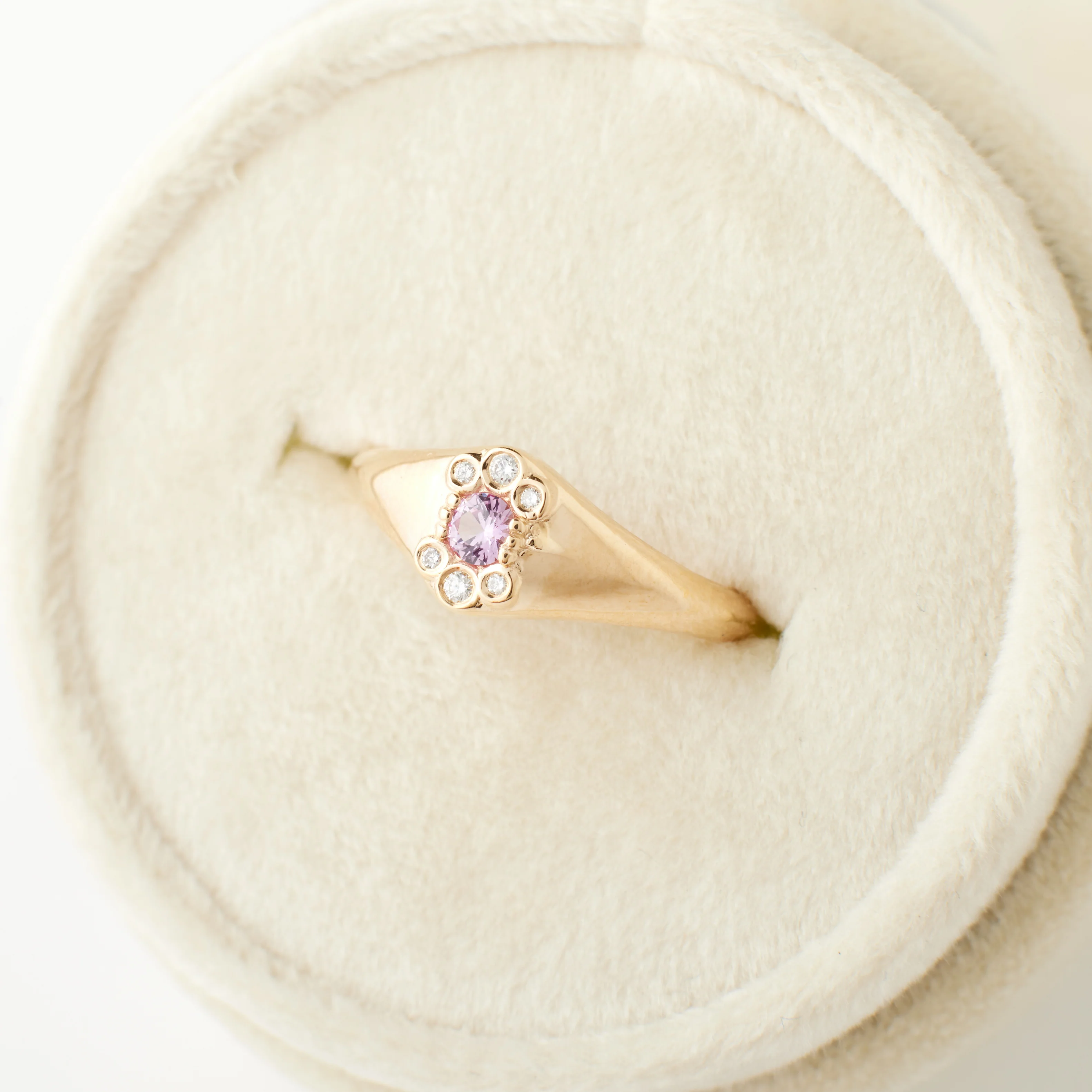 Why it's special: Meet the Emerson ring ā a modern twist on a traditional signet ring.Ā This sweet and dainty ring features a half halo of lab-grown white diamonds around a perfectly-pink sapphire.Ā