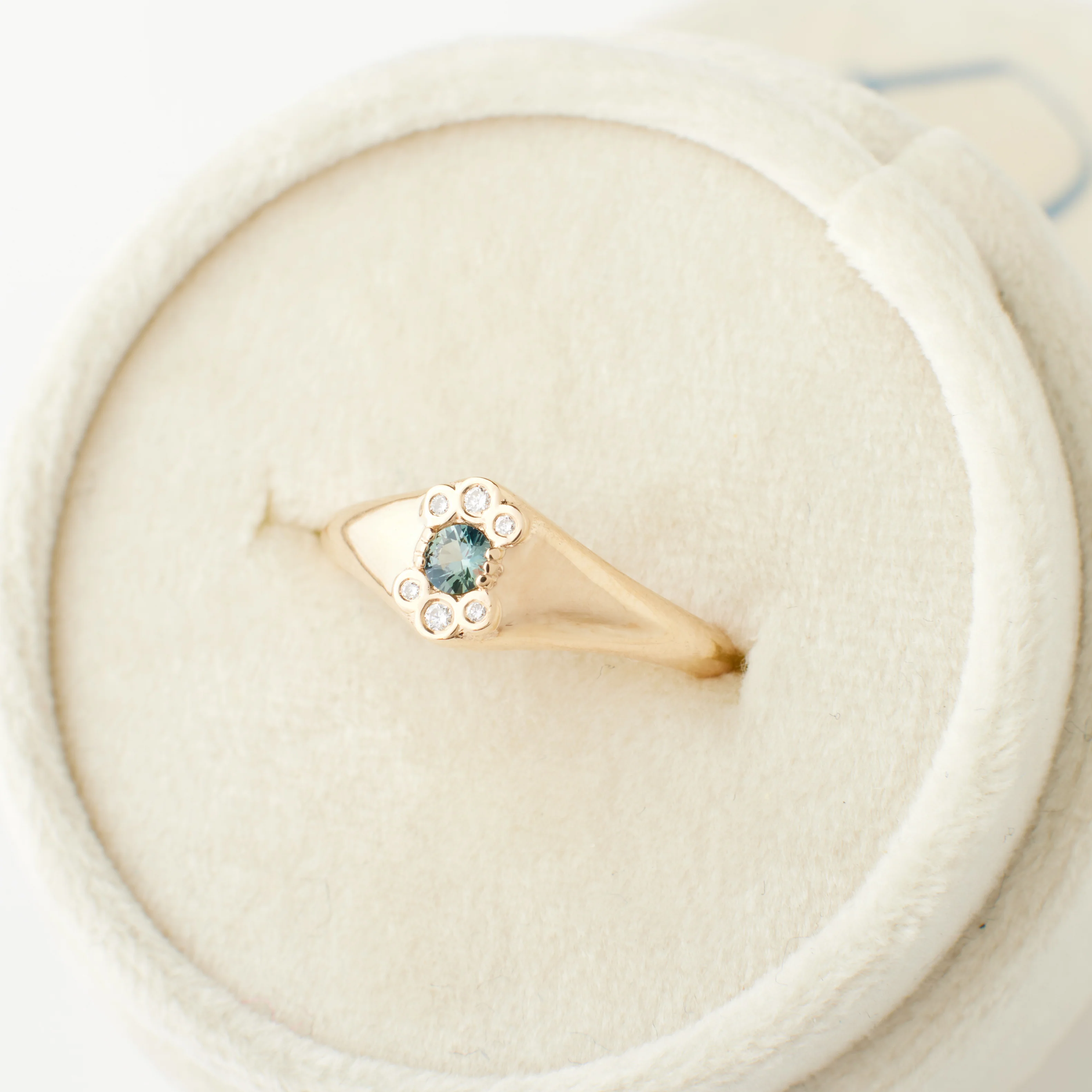 Why it's special: Meet the Emerson ring — a modern twist on a traditional signet ring. This sweet and dainty ring features a half halo of lab-grown white diamonds around a lovely teal sapphire.Â