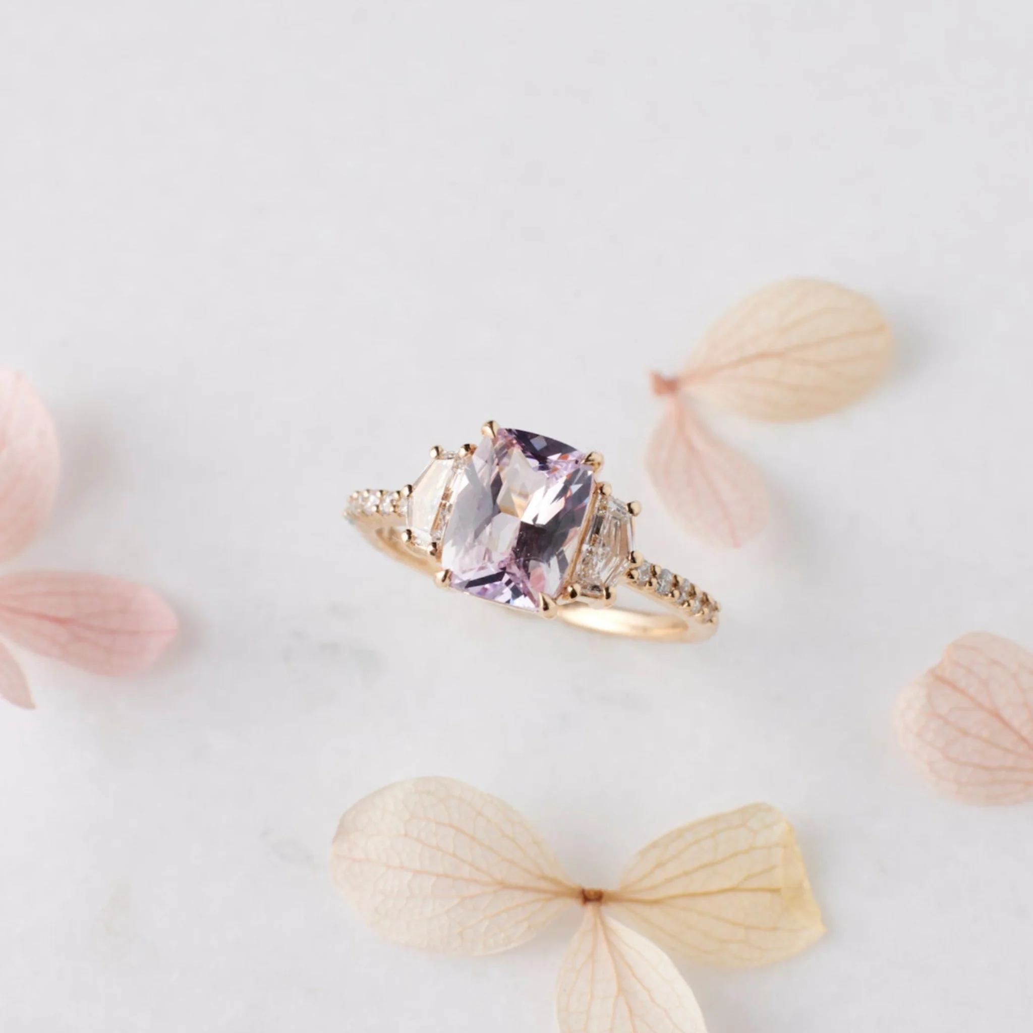 Why it's special: Soft, romantic, and full of charm, the Eveline ring features a 2.01-carat cushion cut sapphire in the palest, most delicate shade of pink. Set in 14k yellow gold, the center stone is flanked by sleek cadillac-cut lab-grown diamonds for a touch of Art Deco geometry. Ten round brilliant diamonds trail along the band, adding sparkle without stealing the spotlight. A quietly captivating ring that’s both feminine and fresh.