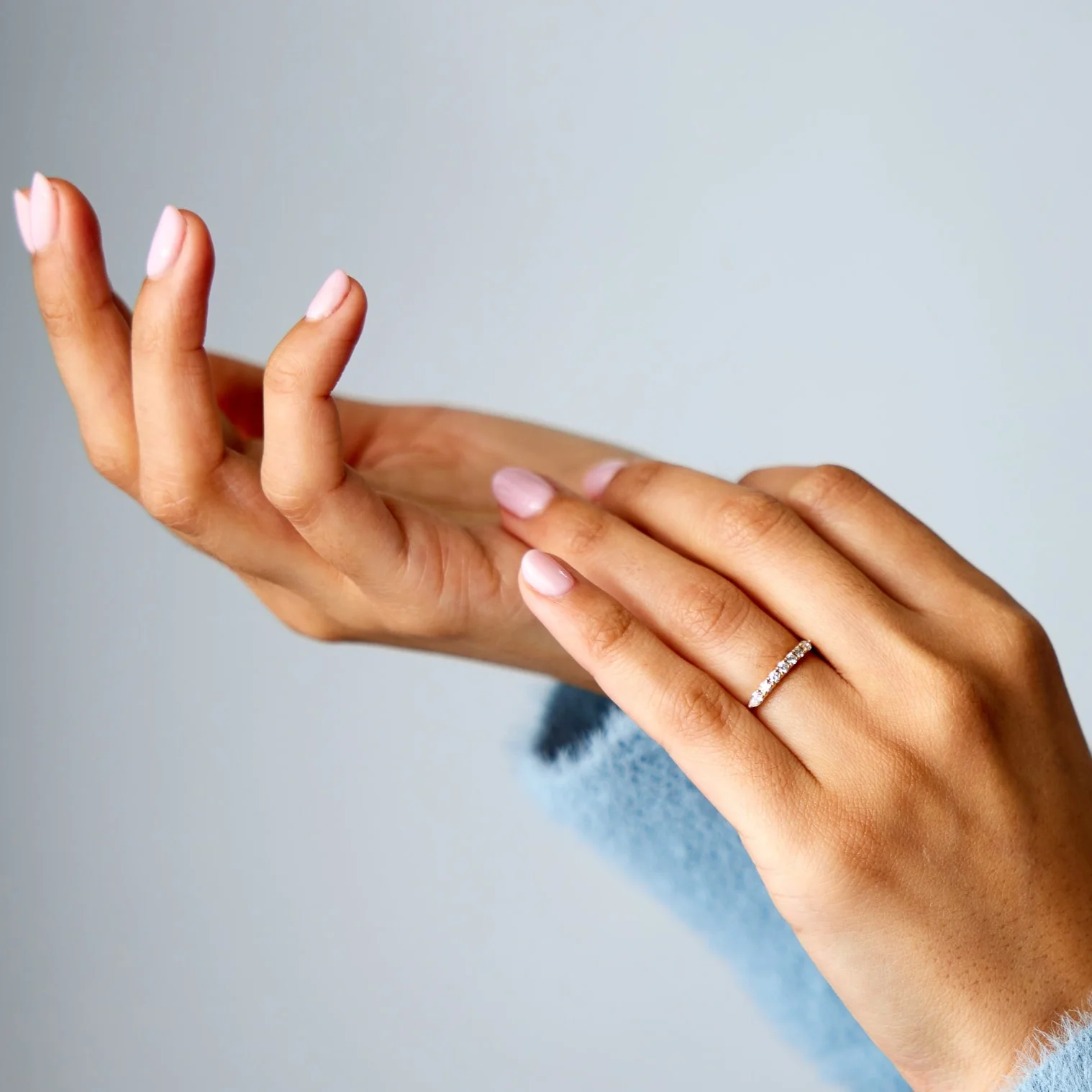 Our Genevieve ring is sparkly, classic and playful with row of round diamonds sandwiched between two darling bright-white pear shaped diamonds. This ring is extremely versatile and works with a variety of engagement rings if you choose to wear it as a wedding band. We love this ring's sparkle and charming silhouette.