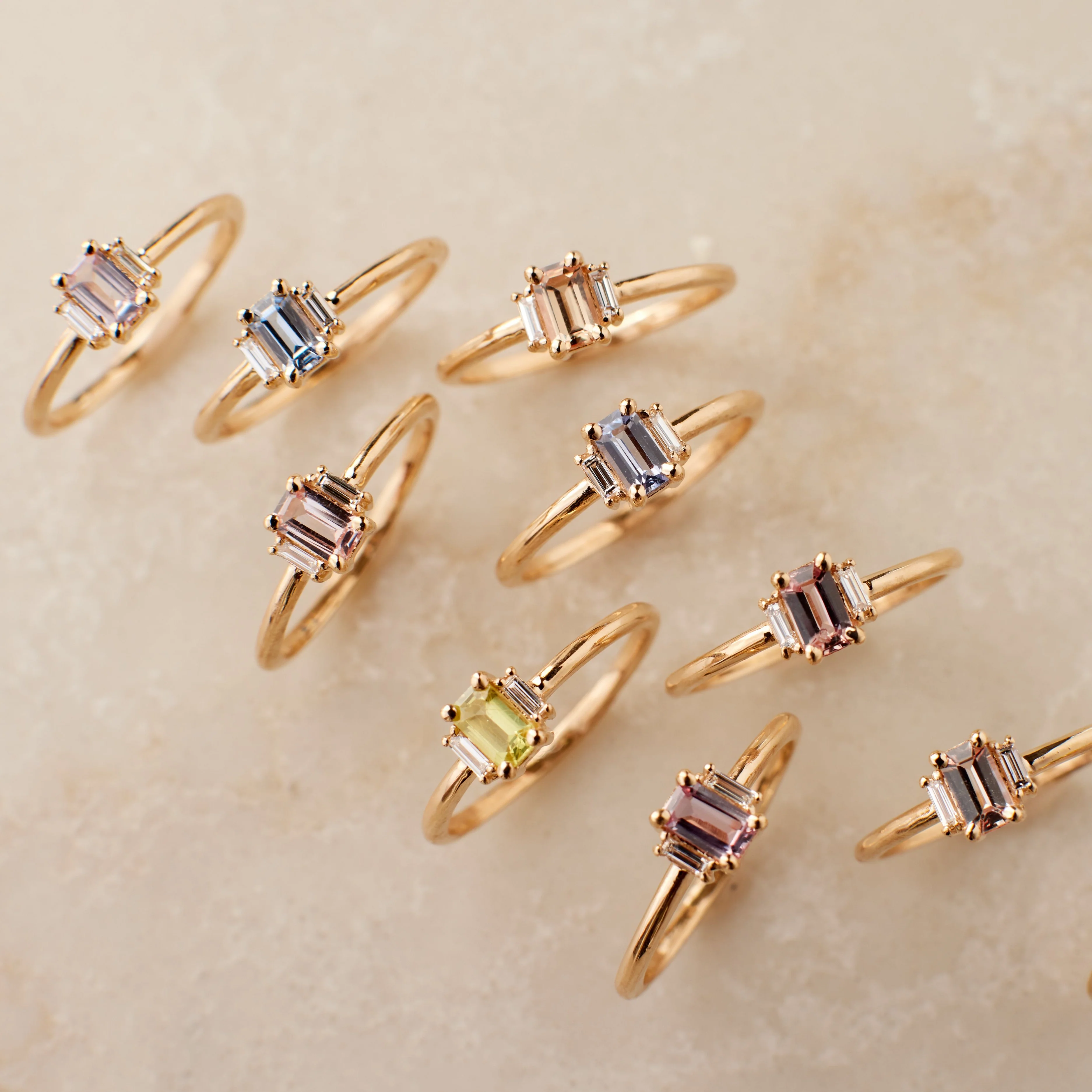 Why it's special: Our Ginger rings are best-sellers for a reason! These sweet, everyday rings feature limited edition emerald cut sapphires accented by petite baguette shaped diamonds. This is a classic 3-stone ring you'll never take off. This version features a blush rose pink sapphire.