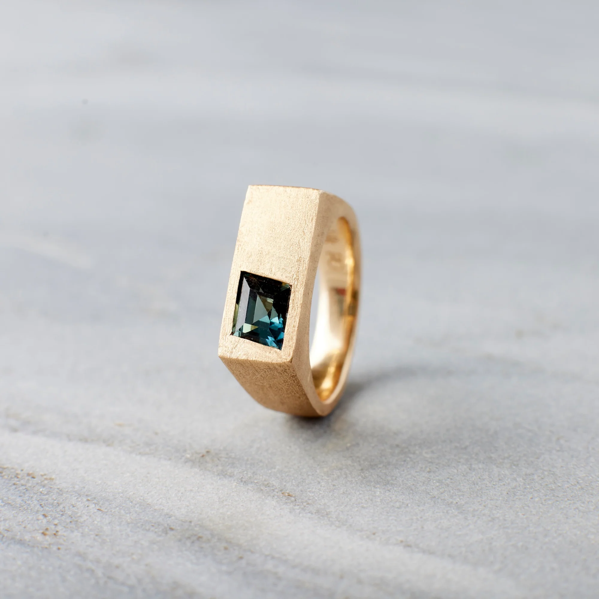 Why it's special: Introducing our Hayes band, a bold new design that redefines modern simplicity. Crafted with a bead-blasted finish, this piece features a 1.26 carat rhombus-cut sapphire flush-set slightly off-center for a distinctive, contemporary profile. The sapphire reveals a dynamic play of color, shifting in the light from brighter blue-teal to deeper green-teal flashes. Its angular geometry and ever-changing hues bring striking character, while the matte texture of the band grounds the design in understated strength. Created as a men’s or gender-neutral style, the Hayes band offers a refined balance of presence, versatility, and modern elegance.