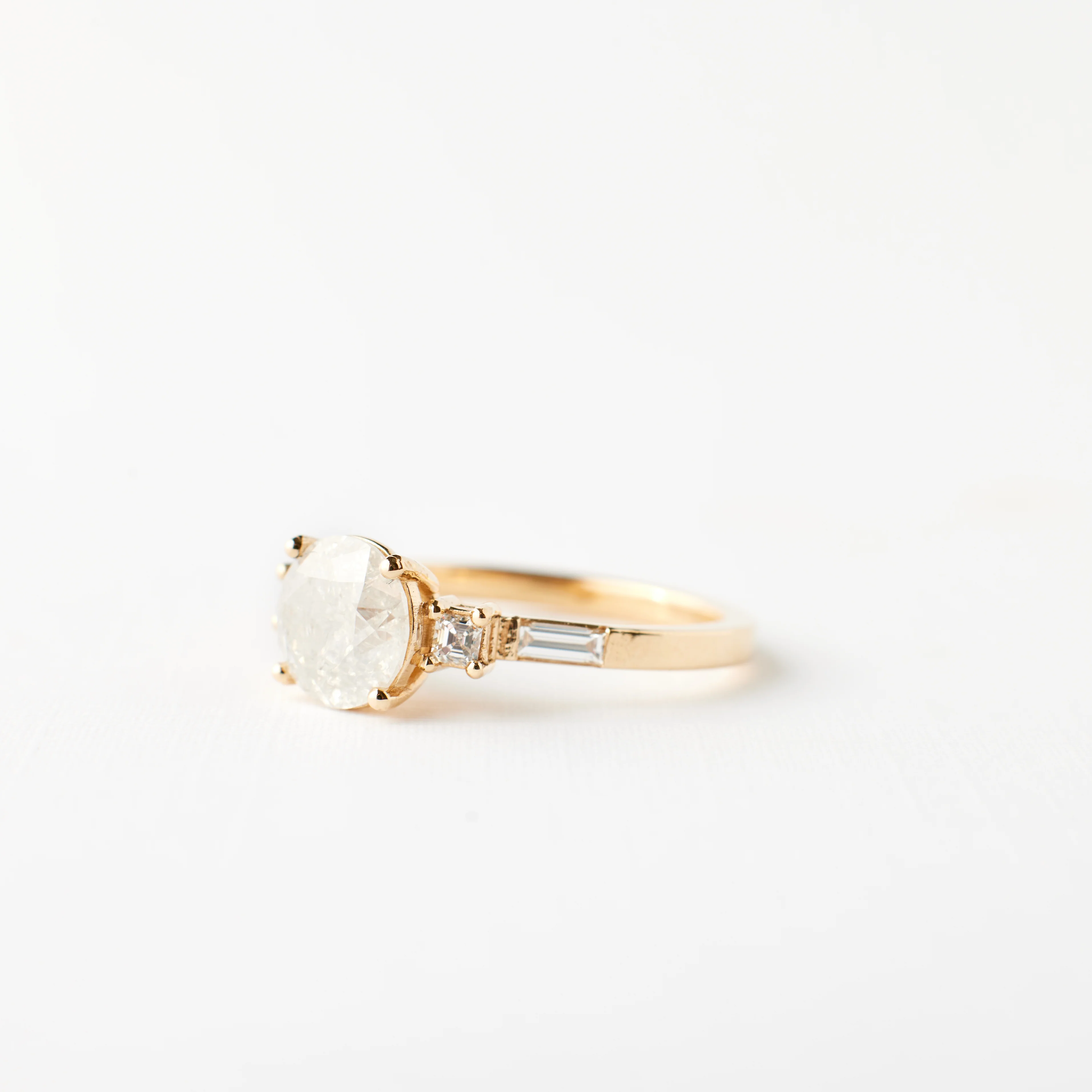 Introducing our brand new and one-of-a-kind design, our Hope ring. Hope is set with with a stunning 1.51 carat icy-white natural round diamond that has the most unique opalescent charm! This contemporary design combines classic elements like channel set baguette and vintage-inspired asscher cut diamonds. The Hope ring exudes modern sophistication and is our favorite style for everyday glamour. Made of 14 karat yellow gold, Hope stacks well with others but also is more than enough to go solo. Someone will be very lucky to have such a unique diamond in their jewelry box.