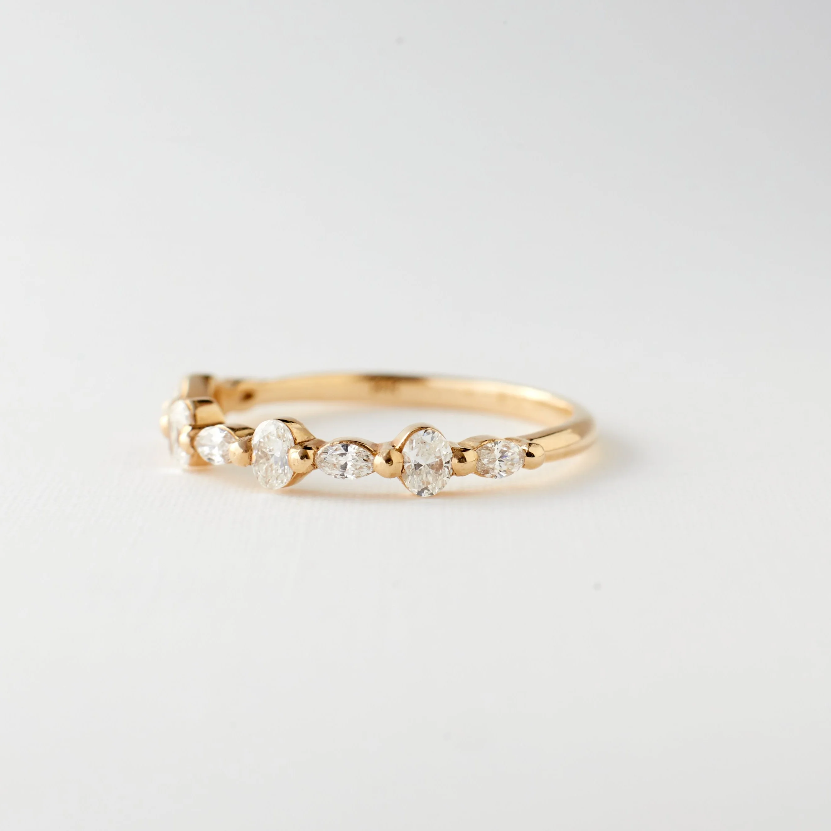 If diamonds dancing across your finger is your style, then this is your ring! We kept the gold to a minimum in this sparkle-forward style and let the diamonds doĀ the talking. Alternating oval and marquise diamonds seem to float on the finger while castingĀ sparkling rainbows.Ā