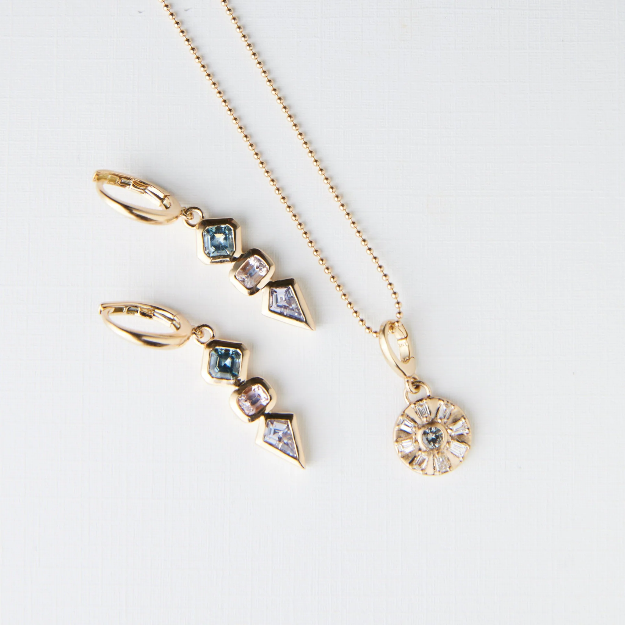 Why they’re special: The Isla Earrings are all about color and movement—and they’re truly one of a kind. Each earring pairs a teal Asscher-cut sapphire with a light pink cushion-cut spinel and a soft lavender kite-shaped sapphire, stacked in perfect harmony. Set in slim bezels with open backs, they catch the light beautifully as they move. Elegant, playful, and full of soft sparkle—the Isla Earrings are a little celebration of color and effortless beauty.