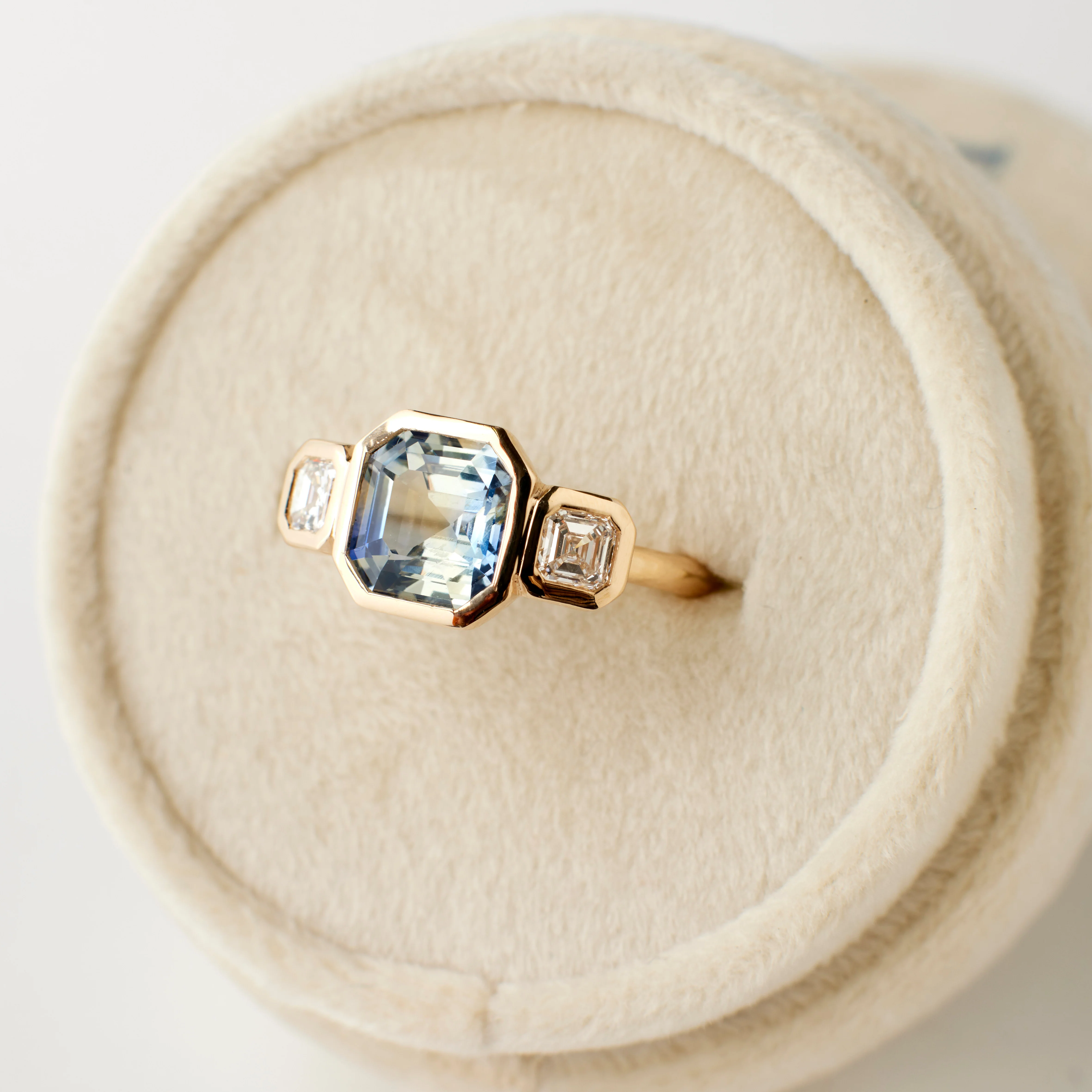 Why it's special: Meet our Ivy ring, a brand-new design that brings a fresh perspective to a timeless style. Crafted in warm 14 karat yellow gold, this piece features a 2.54 carat asscher cut sapphire in a soft cobalt blue, animated by light blue highlights and subtle flashes of golden-yellow that shift with the light. The bezel-set center stone is flanked on either side by two recycled natural diamonds that add balance and brilliance. With its clean silhouette and dynamic color play, the Ivy ring is a striking statement of elegance and modern refinement.