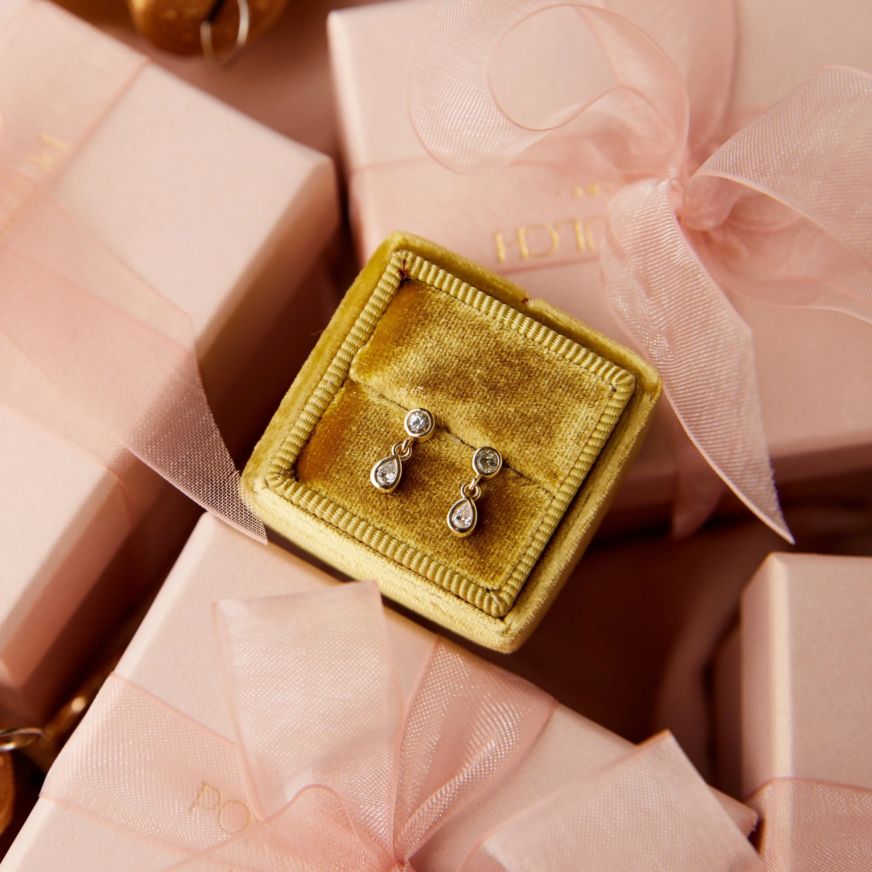 Why it's special: Our newest drop earrings will elevate any look, taking you from day to night—dainty and elevated-yet-playful. Crafted in 14-karat yellow gold and adorned with bezel-set champagne colored sapphires and bezel set pear shaped diamonds.Â