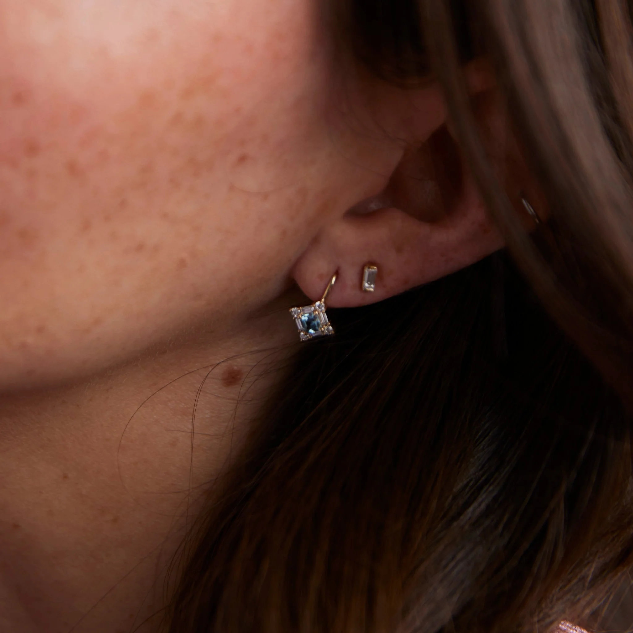 Why they’re special: The Juniper Earrings strike the perfect balance of sparkle and sophistication. Each one features a light blue Asscher-cut Montana sapphire surrounded by a halo of round and baguette diamonds that catch the light from every angle. Set on bishop hooks that sit just below the ear, they have a refined, modern look that feels effortlessly polished. Delicate but full of presence—the Juniper Earrings make everyday elegance look easy.