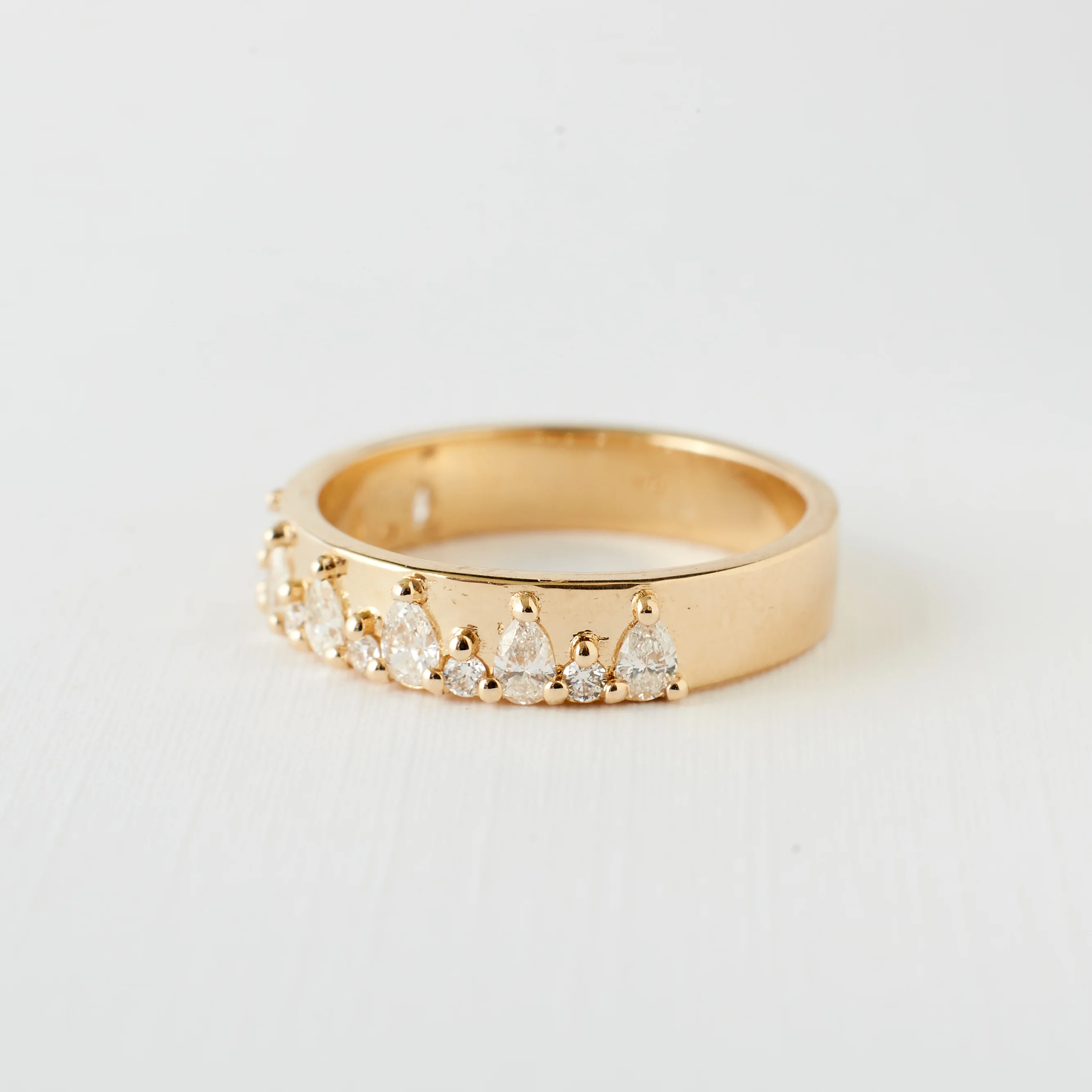 A unique take on a the classic Porter Gulch style, the Kendall ring features a substantial 4mm band decorated with dainty pear and round diamonds. The placement of the diamonds at the edge of the band creates a subtle border with just the right hint of sparkle. We love pairing this ring with engagement rings as a unique wedding band or stacking it with delicate rings to create an interesting mix of textures.