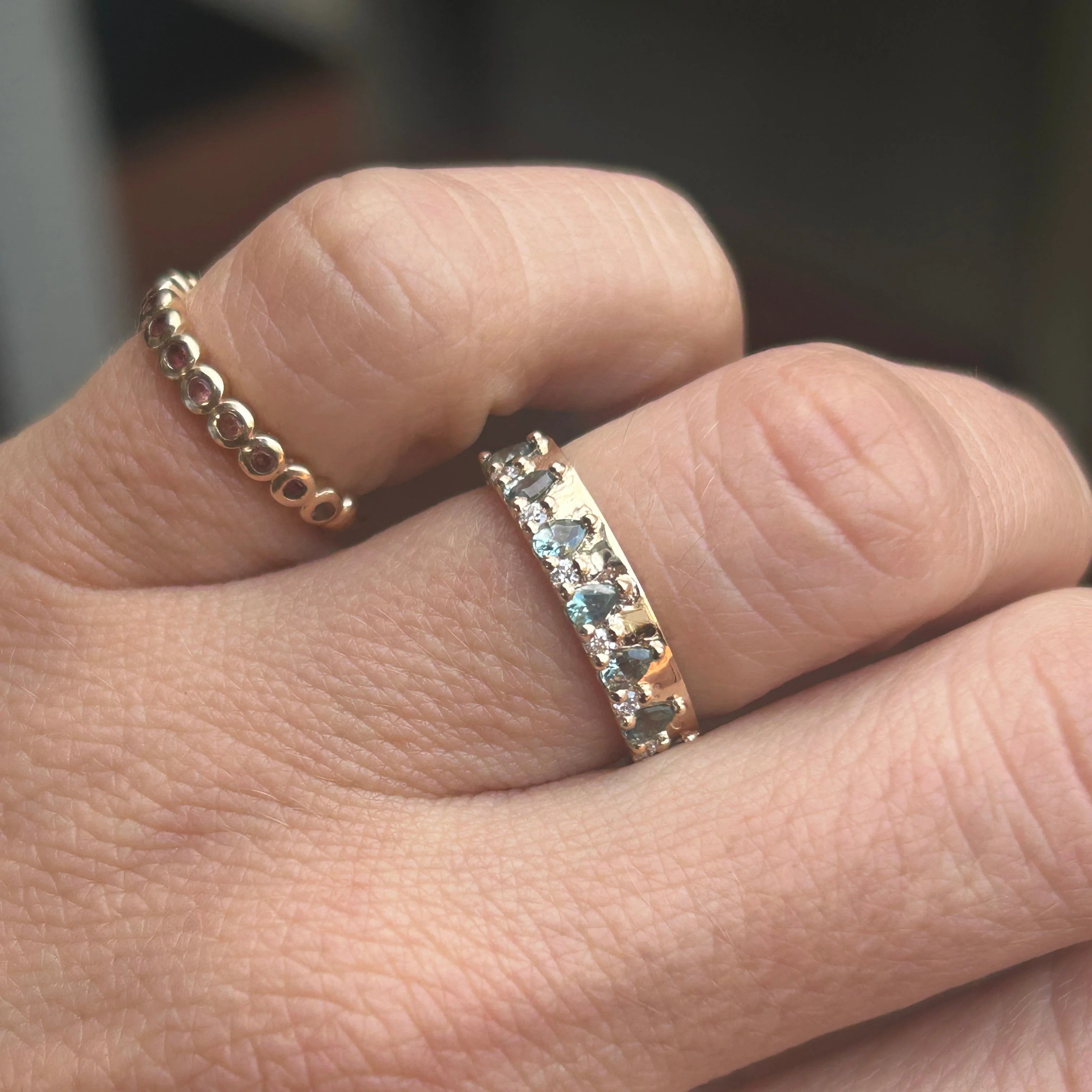 Why it's special: We've added a new twist to our best-selling Kendall ring! This ring is now available in limited quantities set with beautiful green-teal sapphires and bright white diamonds! We love pairing this ring with engagement rings as a unique wedding band or stacking it with delicate rings to create an interesting mix of textures.