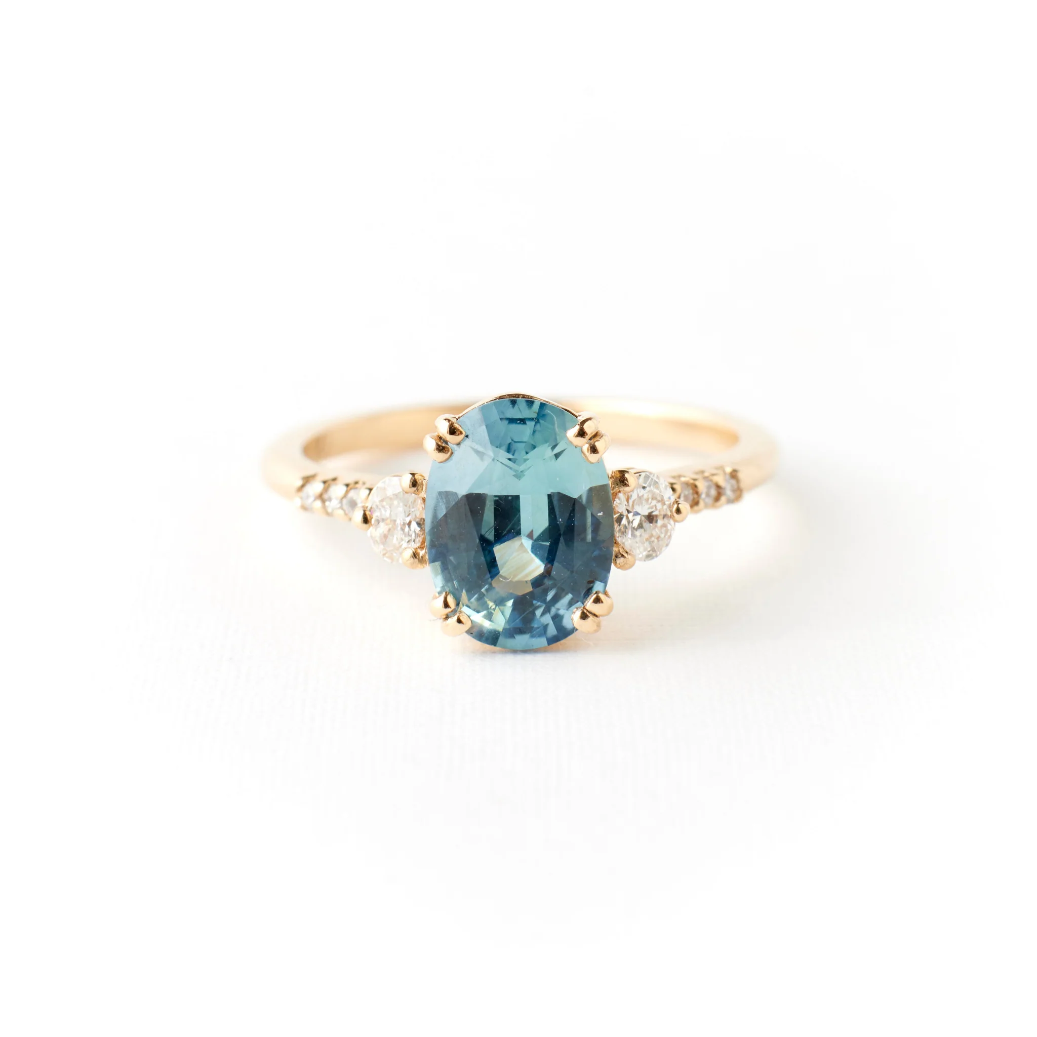 About the Laurel: This style is an updated version of the classic 3-stone ring. Small oval accent diamonds hug either side of the center stone and the ring is completed with pavé diamonds across the top of the band.Â