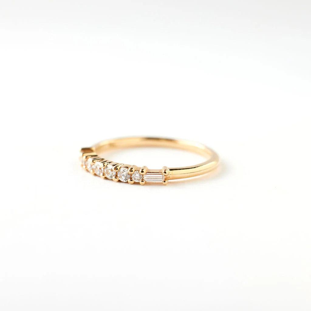 This ring is romantic, sweet, elegant and oh-so-very-sparkly. Our Lennon diamond ring tapers from a center of round brilliant cut diamonds to slightly smaller round brilliant cuts to the subtle step-cut of two baguette diamonds. We love this ring for it's elegance on the finger and it's classic style. We also love that if you choose to wear this ring as a wedding band, it adds a beautiful band of sparkle without stealing the show.