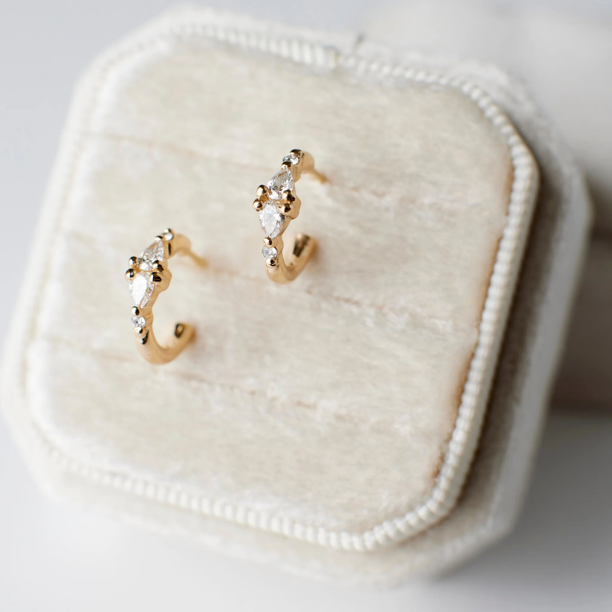 Why they’re special: Say hello to the Lia – Petite Hoops, the smaller take on our classic Lia design. Measuring 11mm, they have the same beautiful mix of round and pear-shaped lab-grown diamonds, just in a more delicate, huggie-style size. Lightweight, sparkly, and easy to wear every day—these are the kind of hoops you’ll never want to take off.
