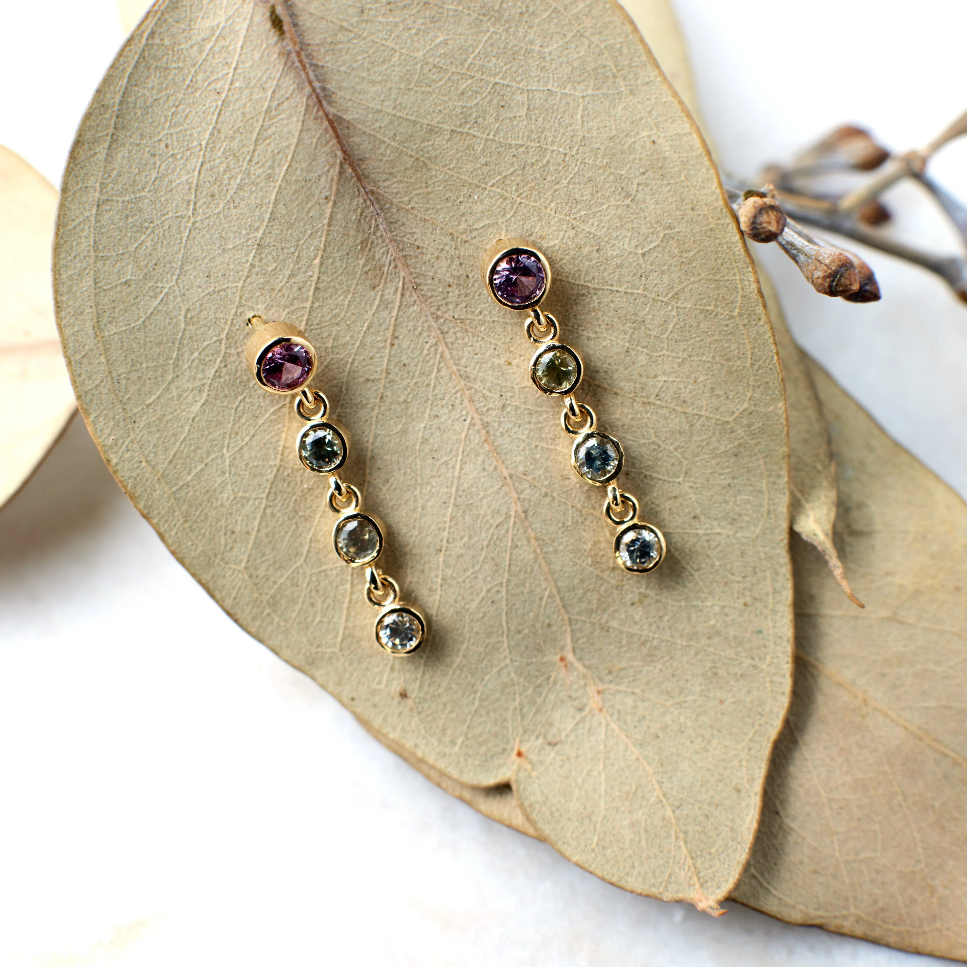 Why they're special: Introducing our Logan earrings! Crafted in 14 karat yellow gold, the Logan earrings feature a bezel-set pink sapphire at top, with three bezel-set Montana sapphires that elegantly sparkle shades of soft greens. These earrings offer a perfect balance of beautiful color and refined design, adding a touch of subtle sparke to any look.