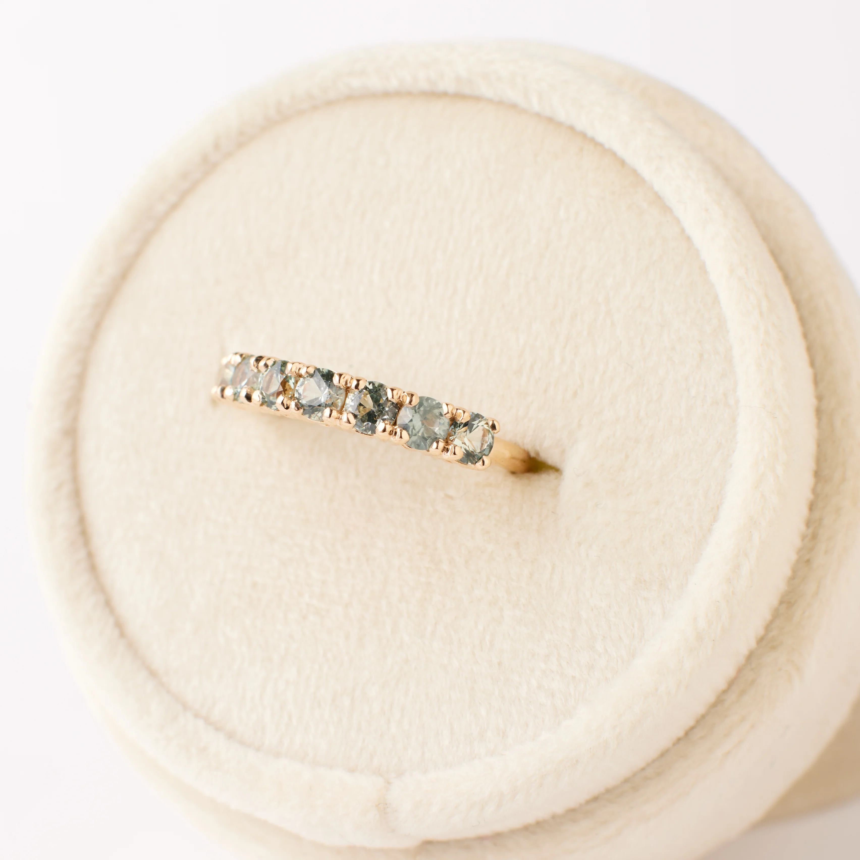 Why it's special: Part of a very limited collection, these special bands feature seven prong-set round Montana sapphires of pale green tones, set side by side. This playful-yet-elegant design is *the* perfect gift, whether it is for yourself or someone you love. Extremely limited!Â