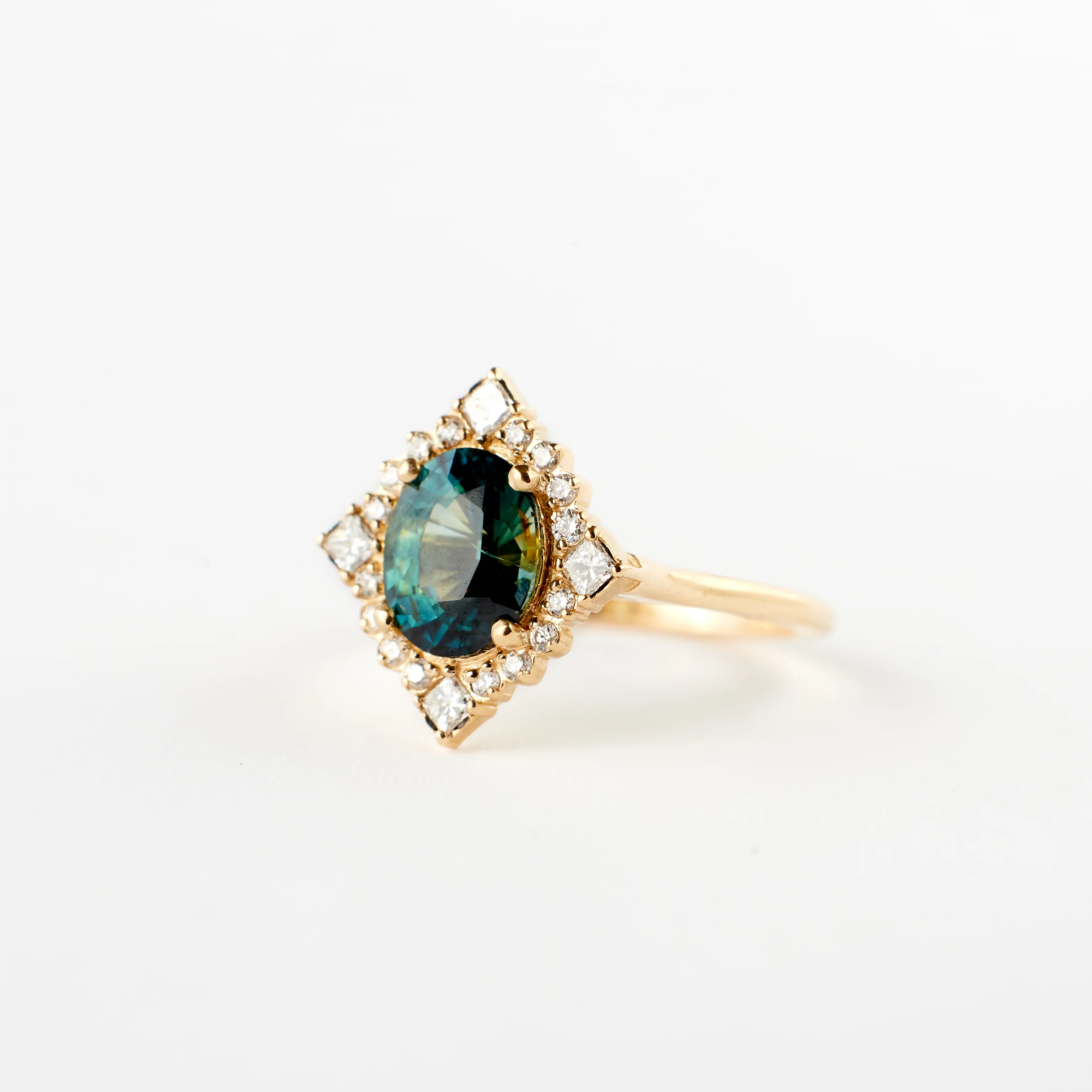 This ready-to-ship Marie ring is made complete with an absolutely incredible 1.80 carat oval sapphire with mixed cuts that brings out its natural beauty and highlights the teal-green-blue hue. Enveloped in a halo of natural white diamonds, this Marie ring is equally dazzling as an engagement ring or a just-because ring.Â