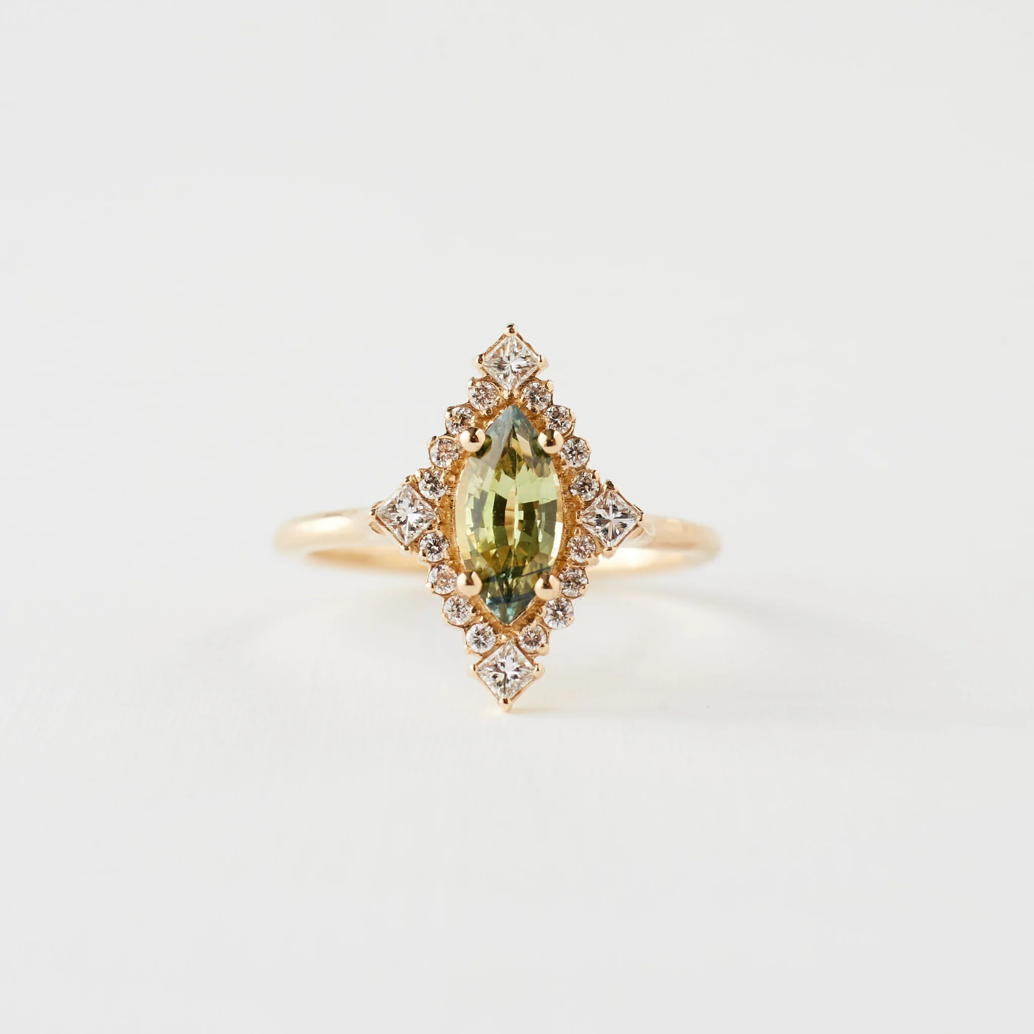 About the Marie: A delicate halo of round and princess cut diamonds surround the center stone of your choosing, adding sparkle and a vintage-inspired feel.