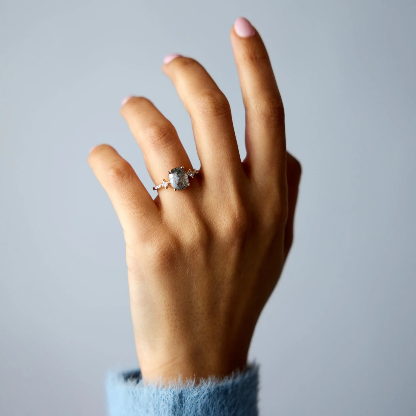 - Set with a 2.09 carat, oval, rose-cut salt and pepper diamond ethically sourced via Misfit Diamonds.Â