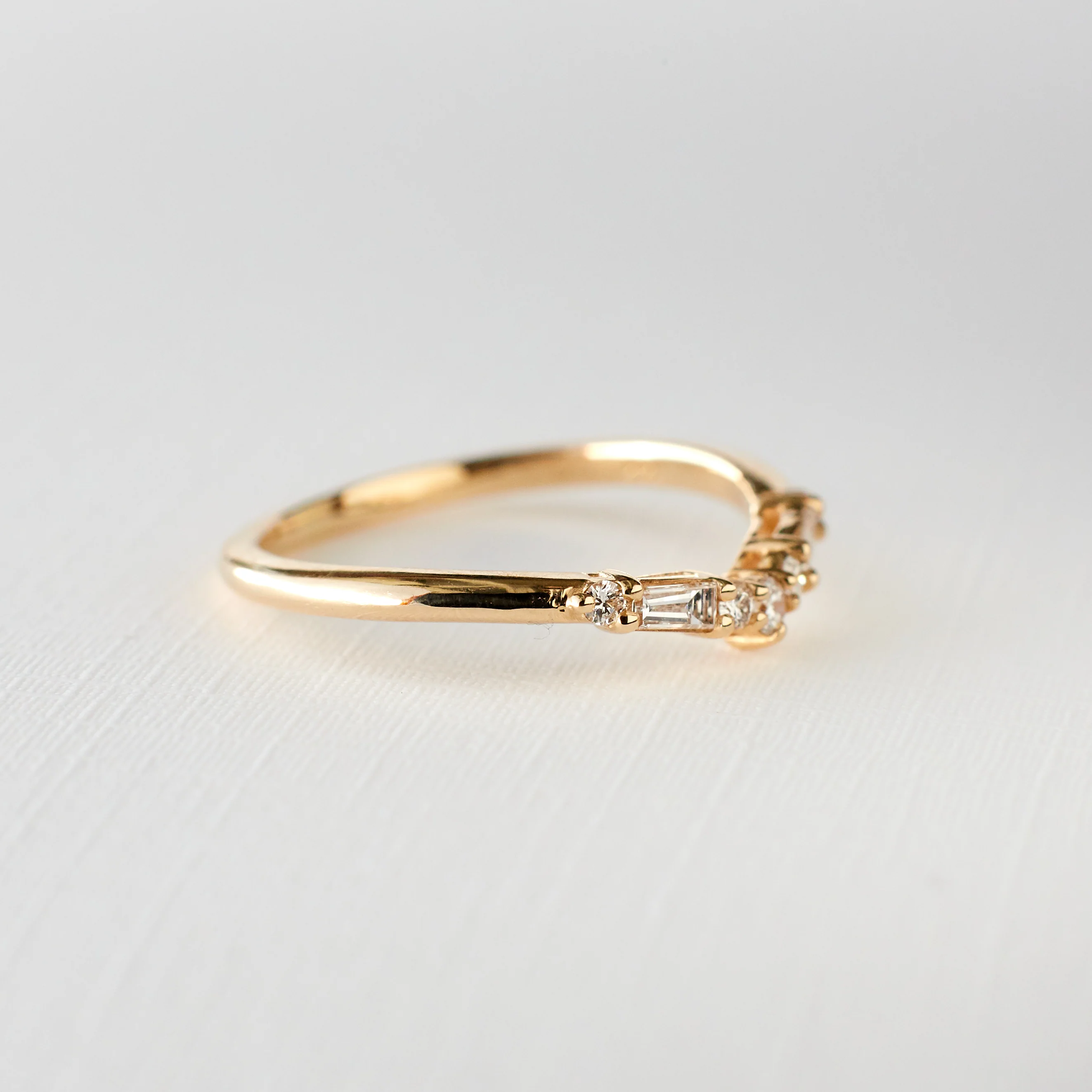One of our most versatile bands, the Millie ring is a beautiful option to hug an engagement or right-hand ring. And the beauty of it is all in the details: round and tapered baguette cut diamonds, prong settings, and a subtle curve to create a nestled stack.Ā