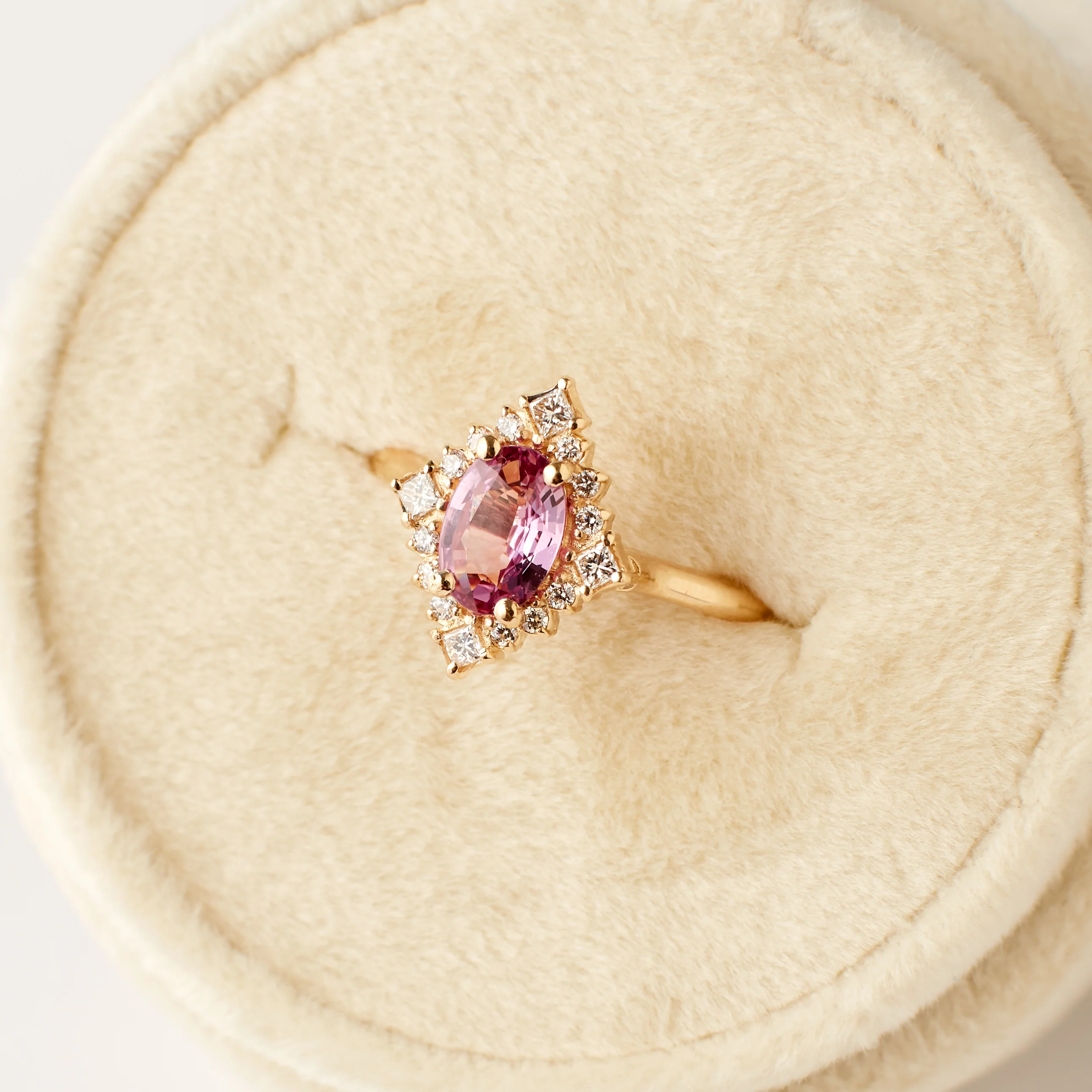 Our first-ever pink sapphire Mirabelle ring is here! This vibrant stone is a beautifulĀ rose-pink color and really pops in a halo of super bright-white princess cut and round diamonds. This ring is a classic with a twist!Ā