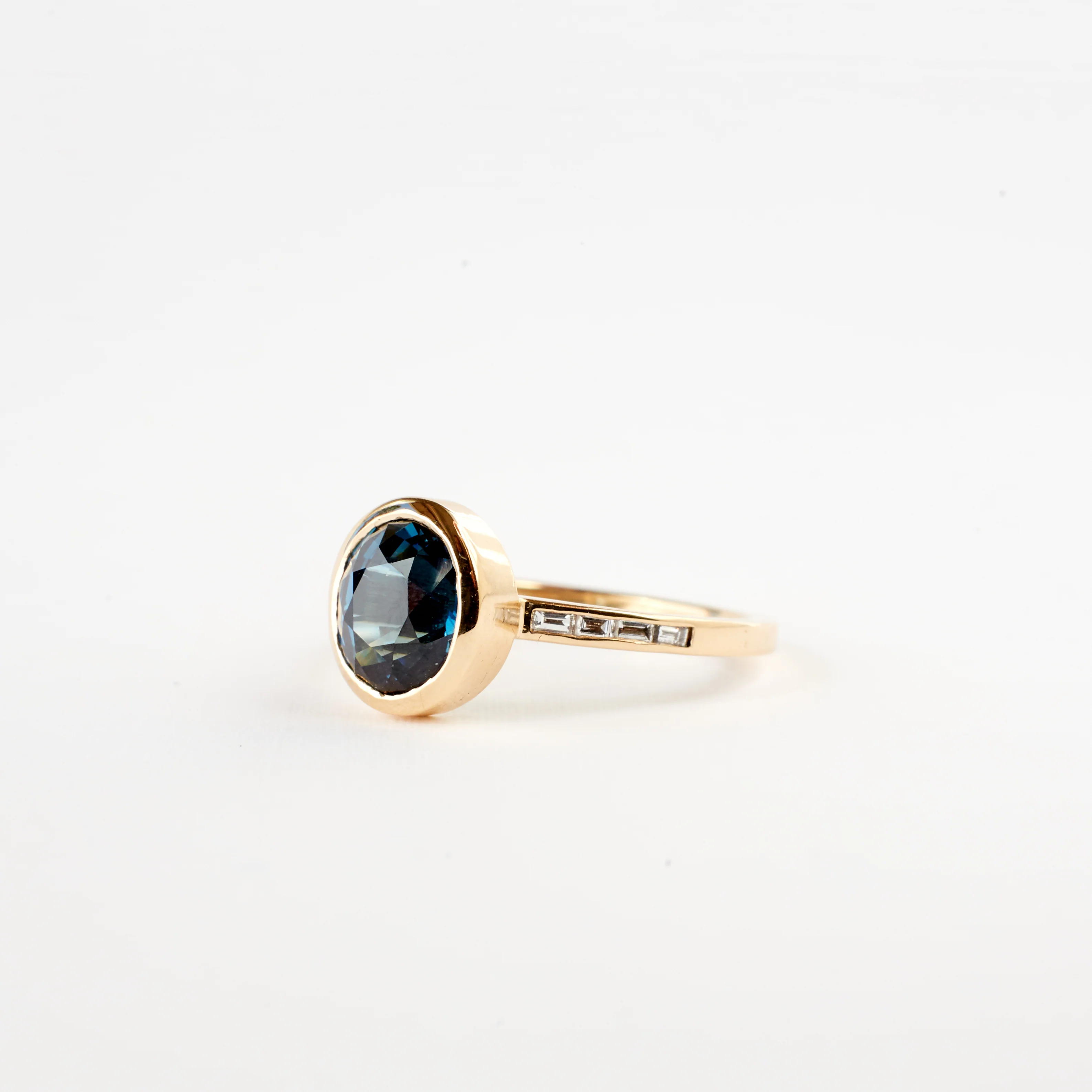 Bevel-setting lovers, this ready-to-ship Presley ring is for you. Set with a magnificent 2.16 carat oval sapphire that shines teal, green, and blue, this soft, round design puts the focus on this moody blue stone.