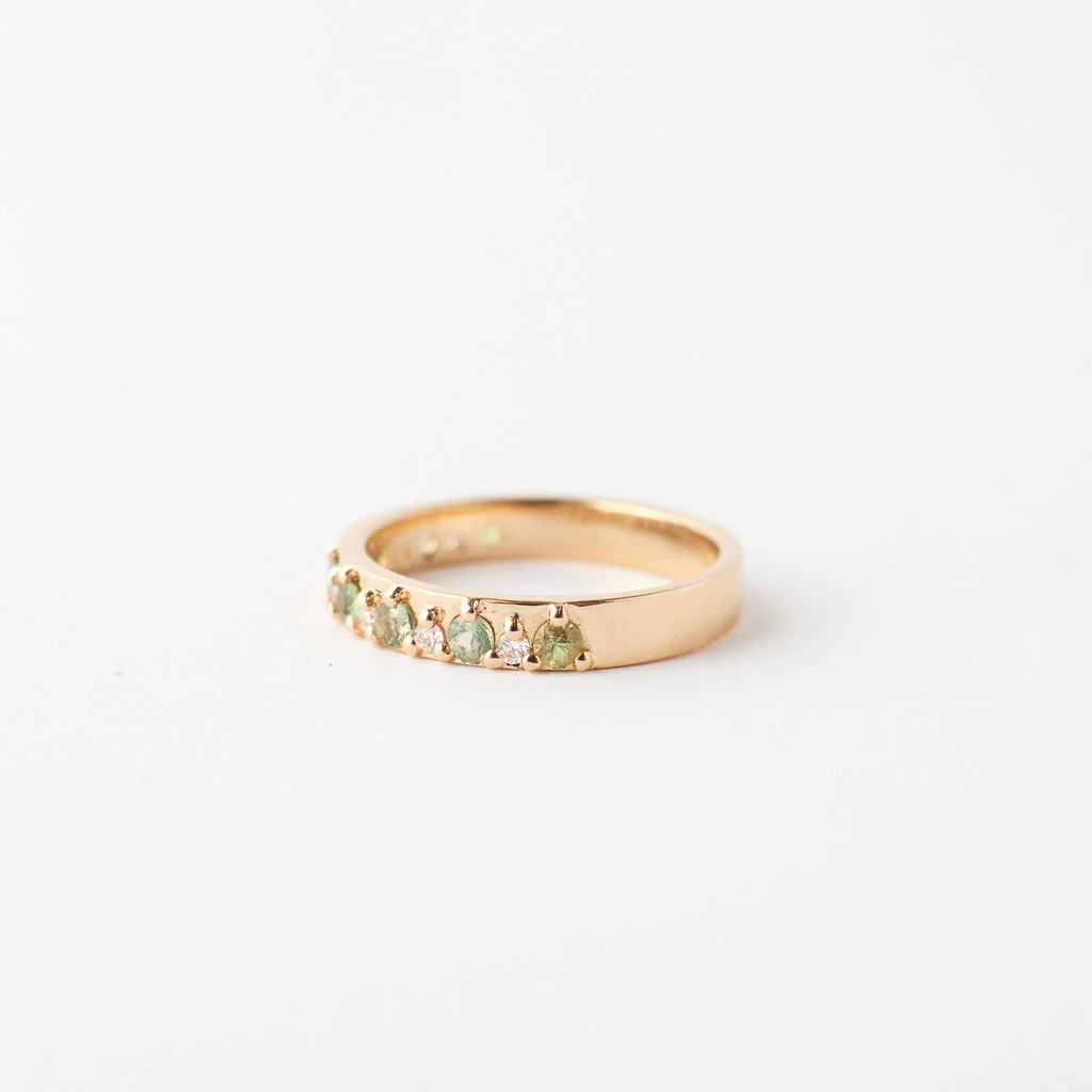 Whether worn as wedding band, solo or as a stacking ring our green sapphire and diamond Roma ring hits the mark! Featuring an array of lightly saturated green sapphires ranging from minty-green to grassy green, each band is a little different making it completely yours. This timeless ring, with its elegant design and endless sparkle, is bound to become a cherished heirloom that will be adored for generations.