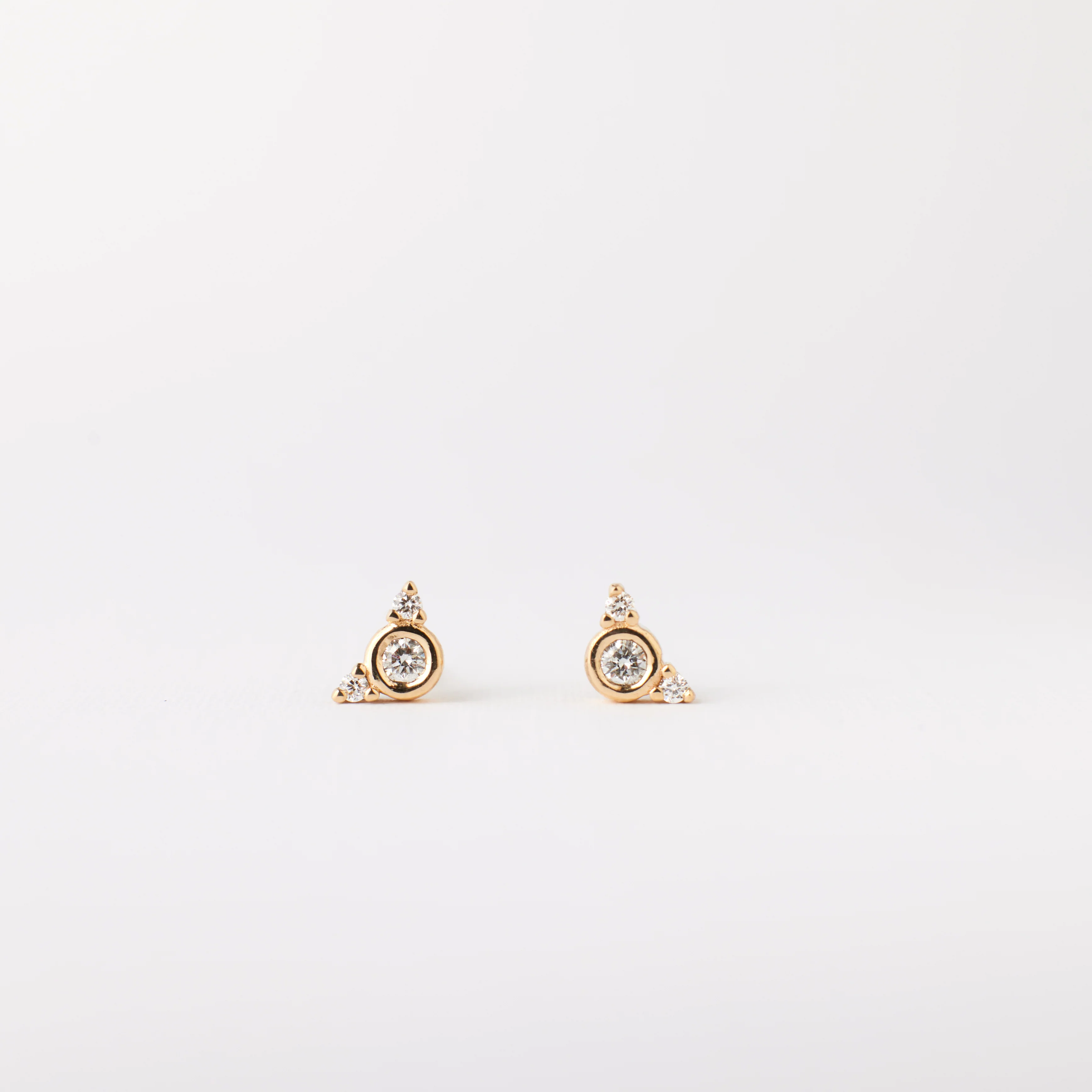 Elevate your earring collection with our dainty Violet earrings, crafted in 14 karat yellow gold and adorned with a shimmering 2mm round brilliant cut diamond, accented by two petite 1.2mm diamonds. Perfect for second or even third ear piercings, these earrings add a touch of sparkle and elegance to every day.Â