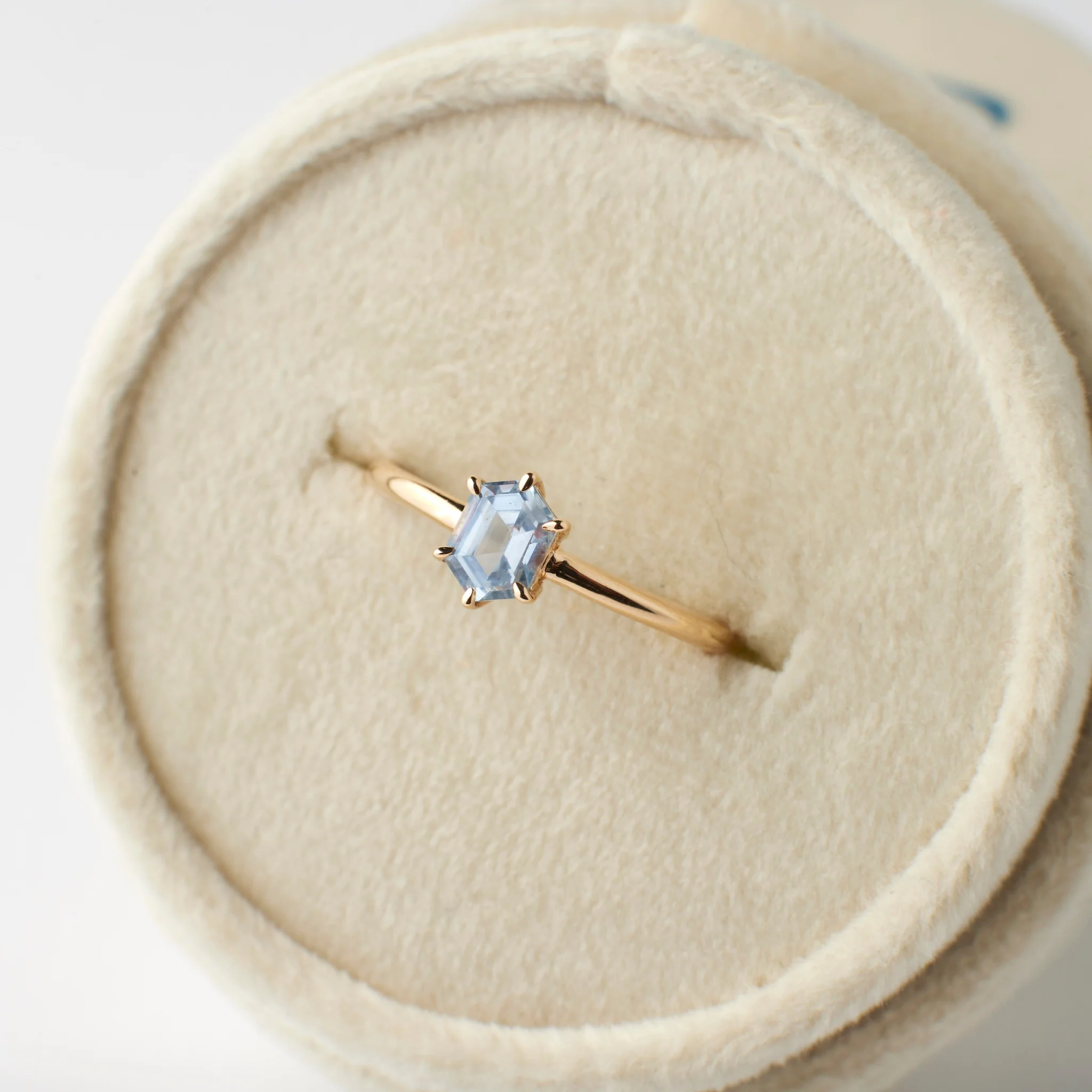 Set with a .61 carat, unheated, glassy light blue hexagon sapphire, ethically sourced from Montana