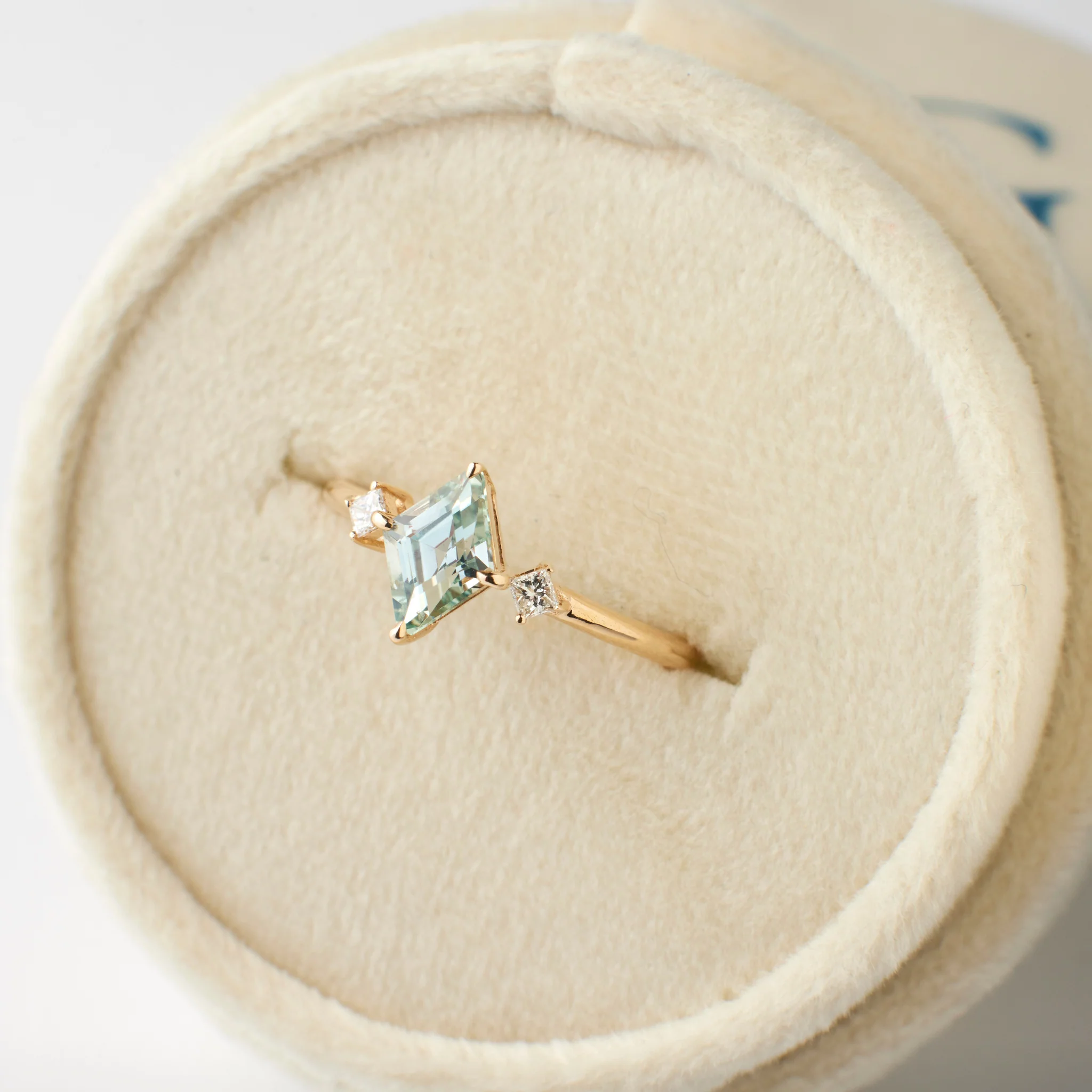 Why it's special:Â Centered around a .90ct kite-cut Montana sapphire in a misty, light blue hue, this ring combines ethereal beauty with modern edge. The geometric kite shape is perfectly complemented by two crisp princess-cut diamonds, adding a touch of brilliance and symmetry. With its soft, airy tone and distinctive silhouette, this piece feels fresh yet timelessâideal for stacking or wearing solo as a striking expression of natural elegance and individuality.
