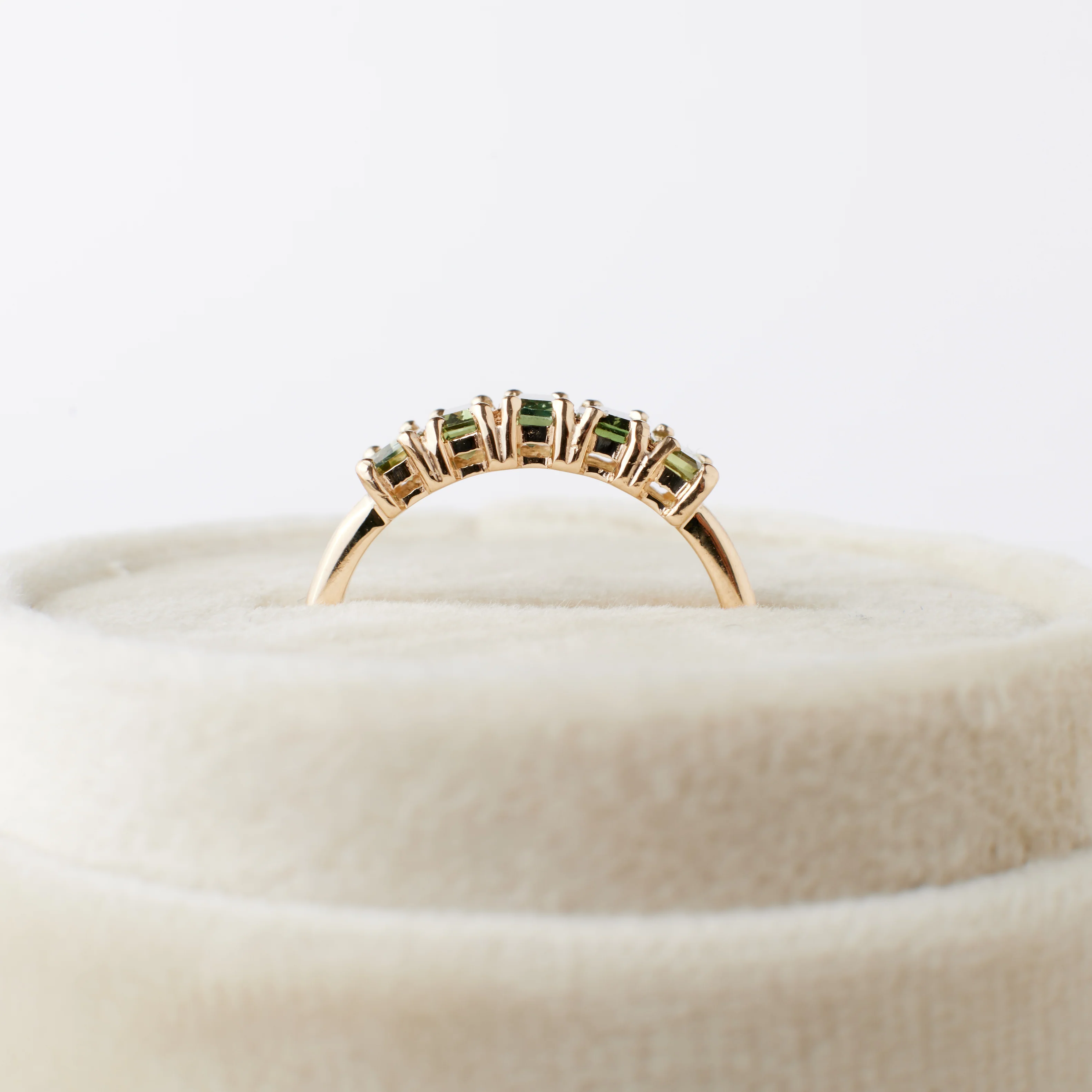 Why it's special: Part of a very limited collection, these special bands feature five prong-set emerald cut sapphires of varying blue, yellow, green and earth-toned hues, set side by side. This playful-yet-elegant design is *the* perfect gift, whether it is for yourself or someone you love. Only 6 Wren rings are available, and no two are alike!